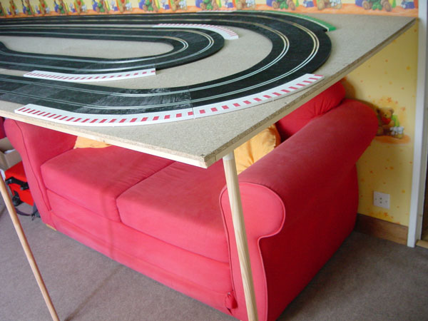 Avant de mettre en place le banking, testes déjà l'enchainement une fois que tu auras mis les bordures et des glissières, voir les murs Ninco : tu n'auras déjà plus d'auto à aller chercher dans le coin, sans compter que ça ne doit pas être l'endroit qui devrait générer le plus de sortie de piste.