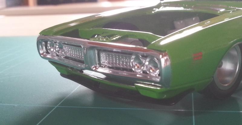 - Gicler au moins une couche de laque AVANT de masquer certaines décals pour mise en peinture de certains éléments. (Le centre du capot avant de la Charger doit être peint en noir, alors que la décal fournie forme le pourtour de cette partie.)