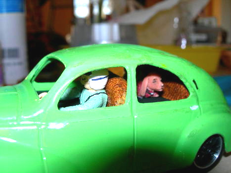 voila ! ensuite, je peint le jaune en noir, pose du pilote et du chien !!!! le tout est en place grace a de la colle en pistolet pour positionner correctement l'habitacle, et c'est le chassis visser qui le tiens !!