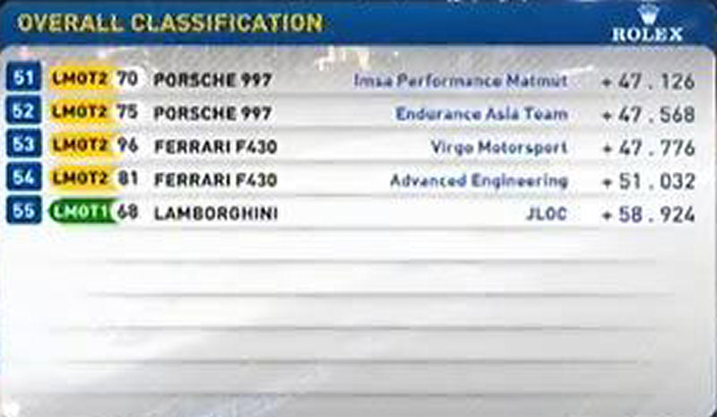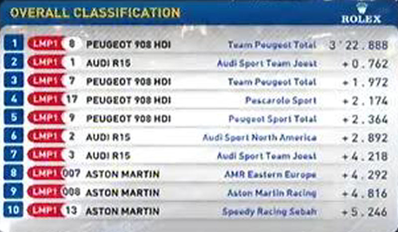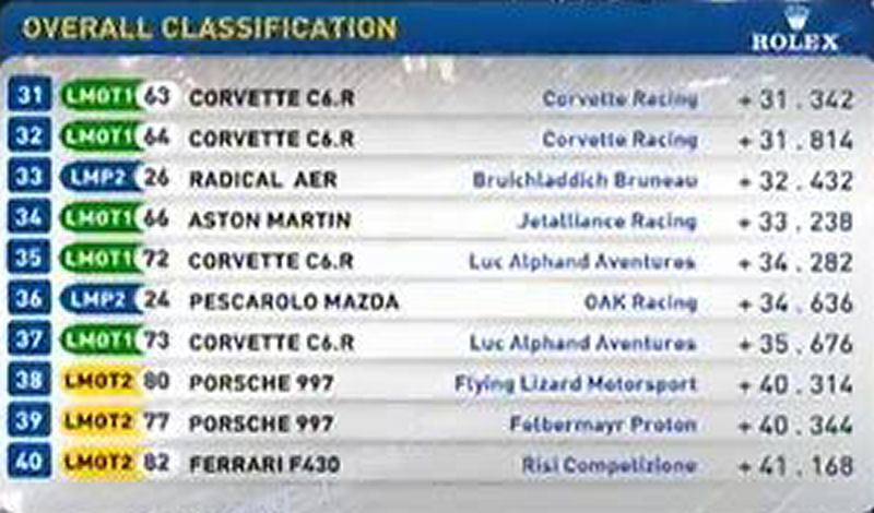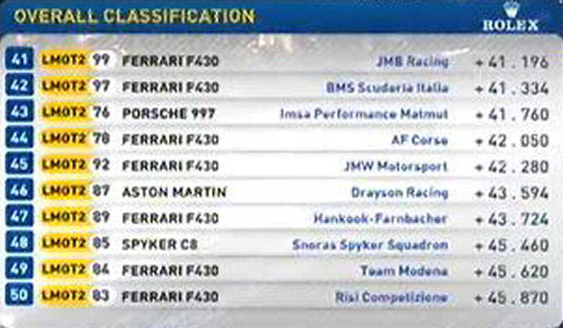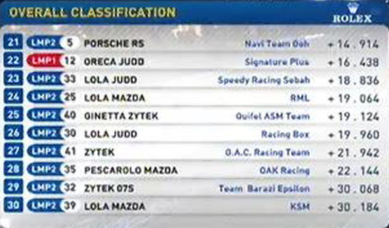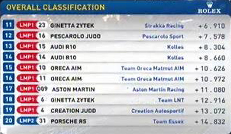 Pour les suivants les Aston Martin sont trés loin : à 4 sec de la pôle, à 2 sec des trois autres Peugot ... cela fait beaucoup. C'est pire pour la Pescarolo Judd et pour les Oreca, vraiment l'écart entre diesel et essence est énorme. L'ACO a obligation de revoir sa copie pour les prochaines éditions ...