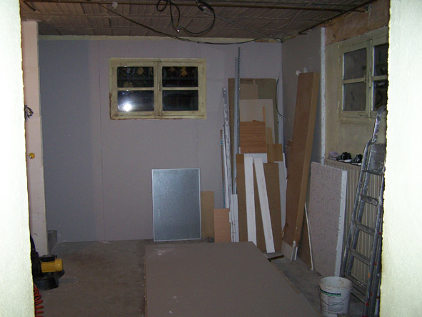 Dans un premier temps, prévoir l'électricité(prises et éclairage) ensuite le doublage sans oublier la plomberie pour ne pas avoir froid pendant les longues soirées d'hivers et de slot.