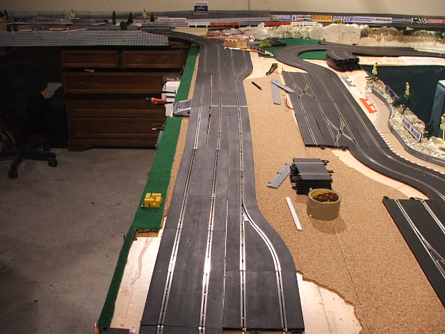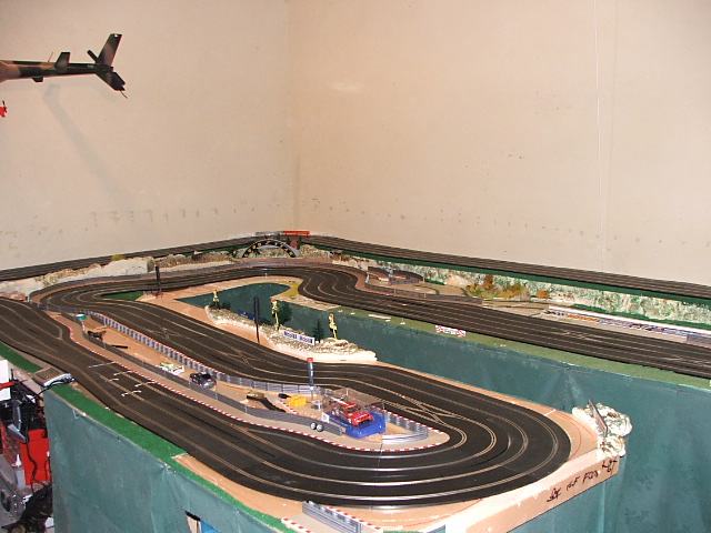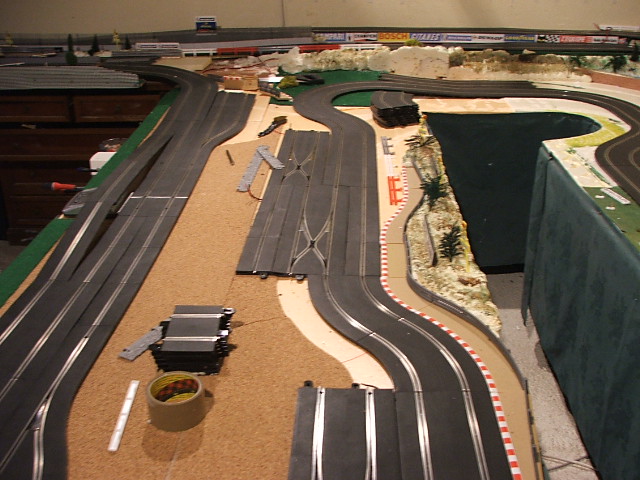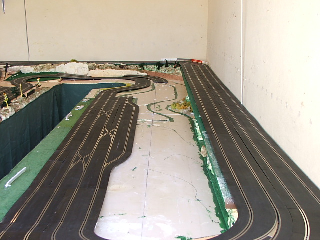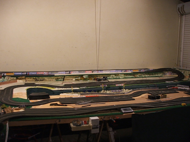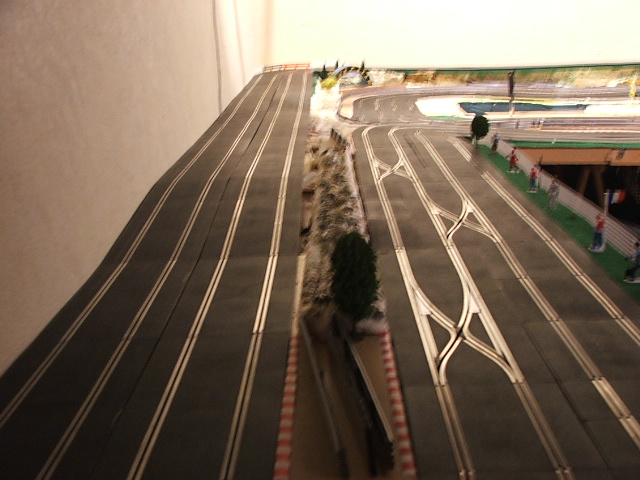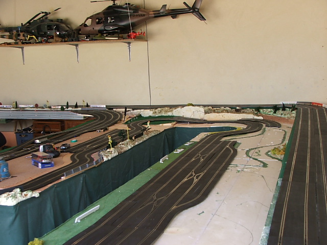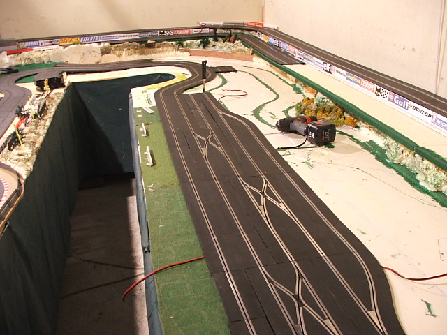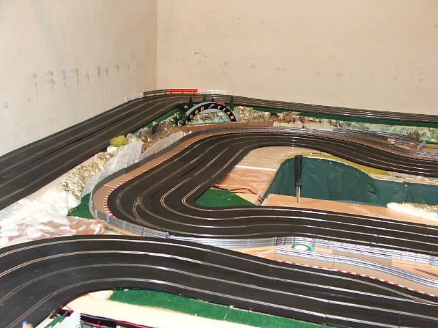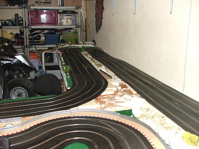 piste scalextric 4 voie (30 metres)dont 3 en digital avec 30 aiguilles , 3 première voie en digital avec aiguilles alimenter séparément pour le passage en 4 voie analogique , un pit line pour le passage de la PB 2 voie ,un pit line pour le ravitaillement ,photo au debut des traveaux