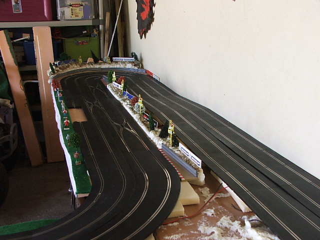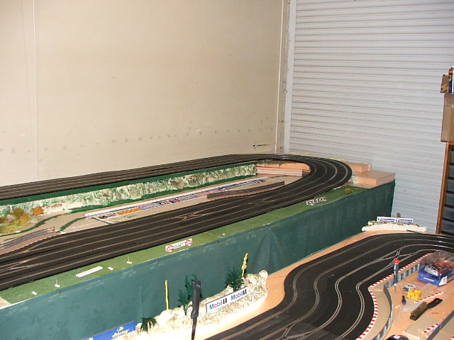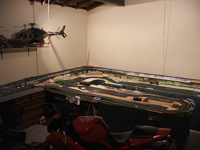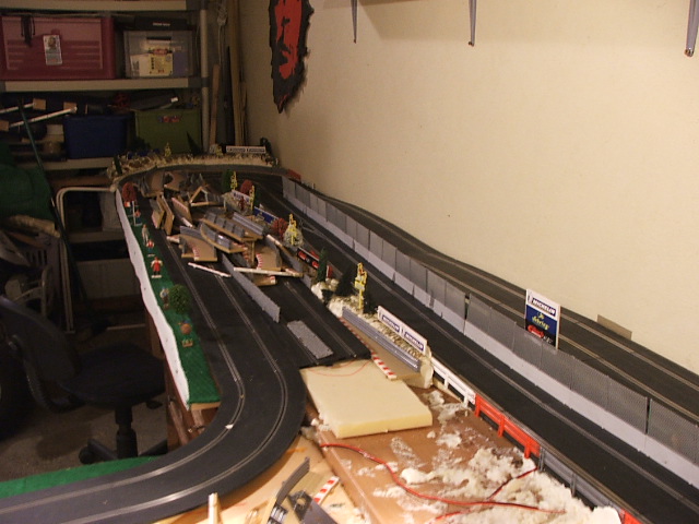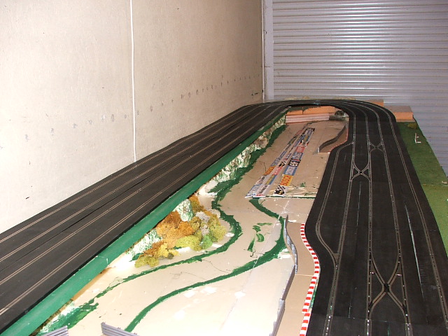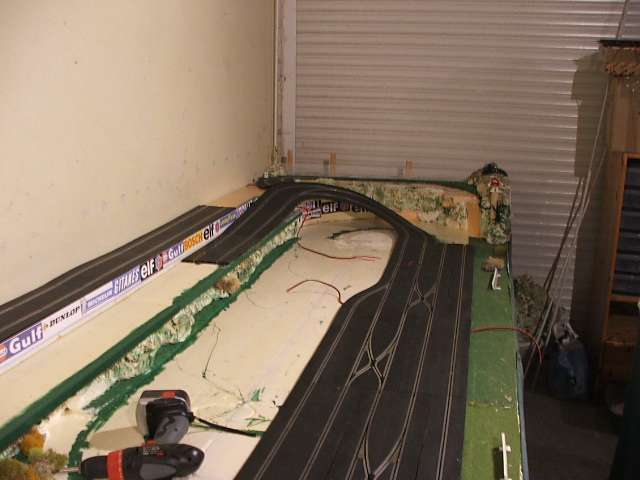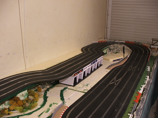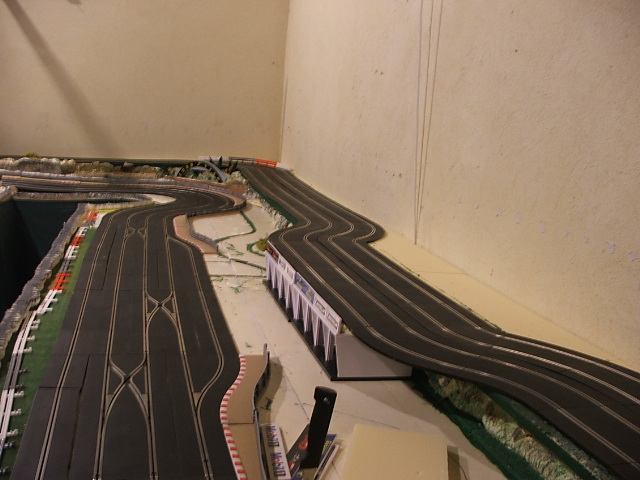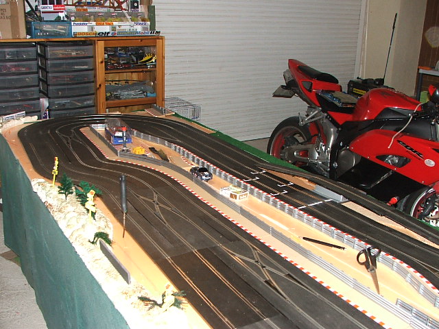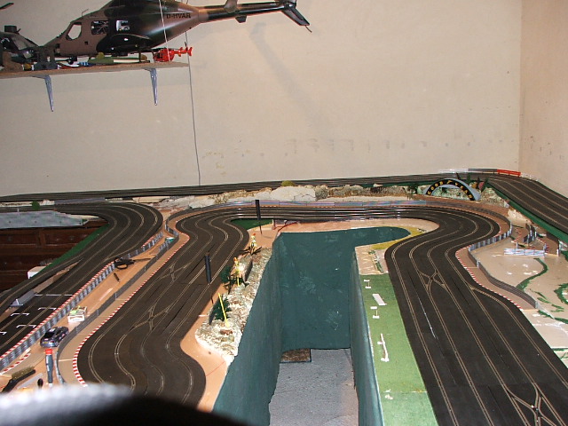 piste scalextric 4 voie (30 metres)dont 3 en digital avec 30 aiguilles , 3 première voie en digital avec aiguilles alimenter séparément pour le passage en 4 voie analogique , un pit line pour le passage de la PB 2 voie ,un pit line pour le ravitaillement ,photo au debut des traveaux