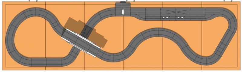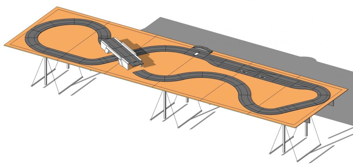 Au vu de ces contraintes, les projections sur lesquelles j'ai travaillé me permettent d'envisager de construire un circuit d'une longueur légèrement supérieure à 8m (au centre de la piste). Ce circuit en forme de huit est implanté sur deux plateaux de dimensions identiques (1,02m x 2,07m). Un appendice destiné à protéger la base de départ est couplé à l'un des deux plateaux. En vue de l'installation ultérieures de bordures extérieures, un espace d'au moins 110mm est laissé libre à la périphérie de la piste.