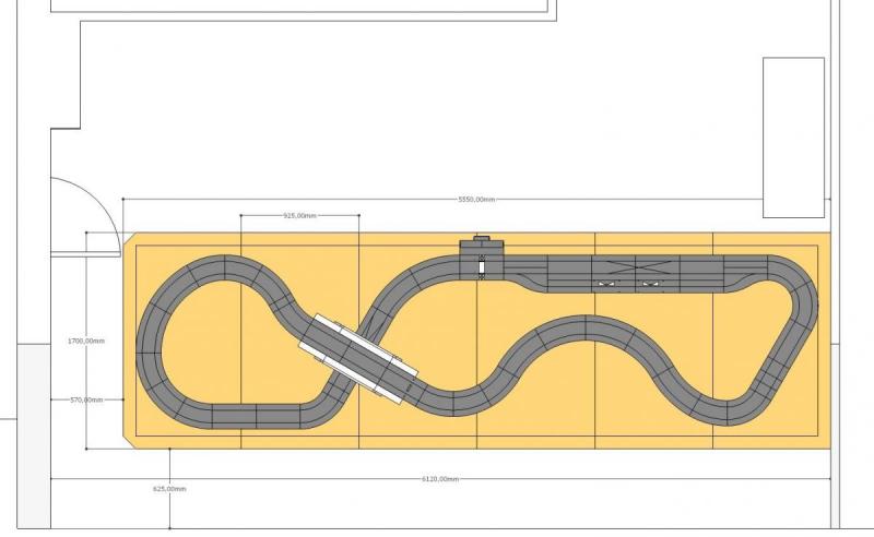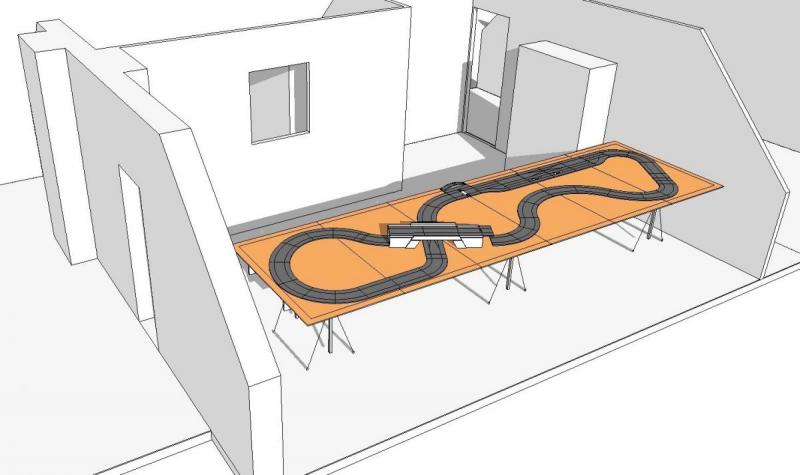 Je n'avais pas envisagé de faire un plateau articulé. Mais je vais étudier cette solution. Elle a le mérite de dégager une bonne partie de la pièce lorsque le circuit n'est pas utilisé. Par contre, sur le mur où se trouve la porte, se trouve également le placard. C'est donc impossible. Pour se faire, il faut donc utiliser le mur ou se trouve la fenêtre.