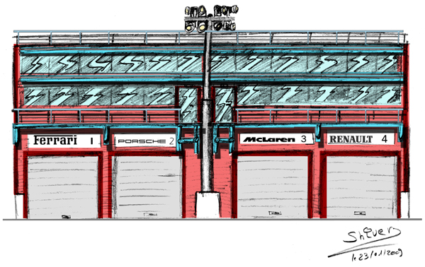 Donc après pas mal d'heure de dessin, voici les garages finales qui veront le jours lorsque j'aurais terminé les murs de sécurité et fait la finition de la piste: