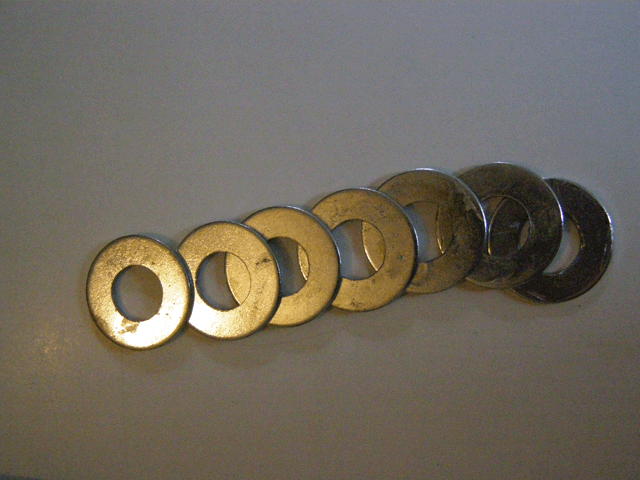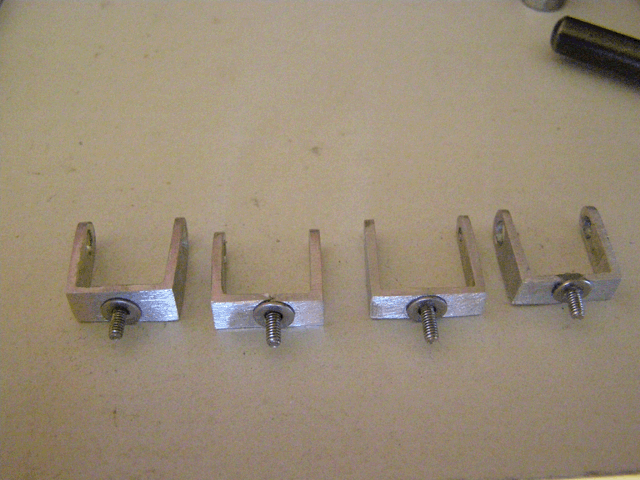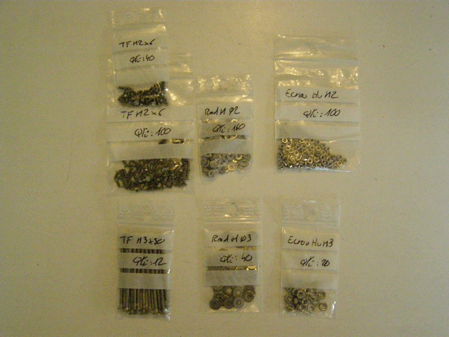 Vis à tête fraisée, écrous et rondelles de 2 mm pour la fixation des spots sur les supports et 3 mm pour créer des colliers de fixation fixer les supports sur les pylônes.