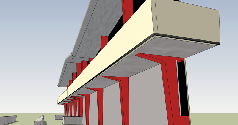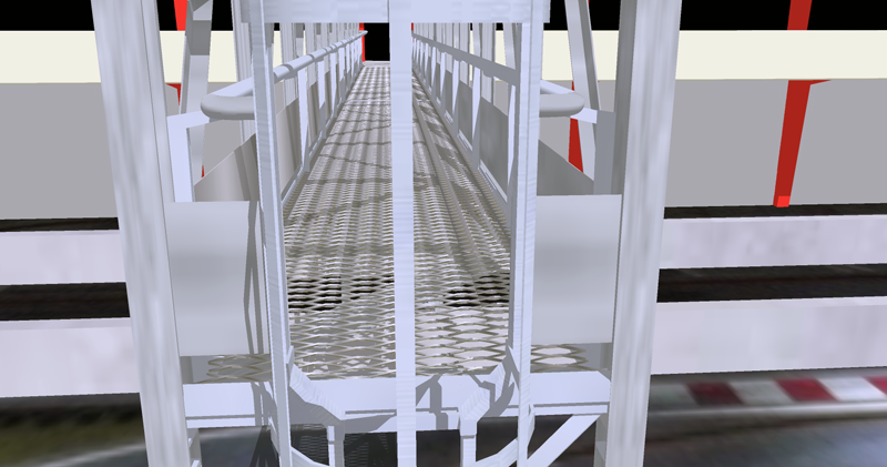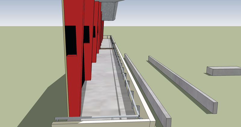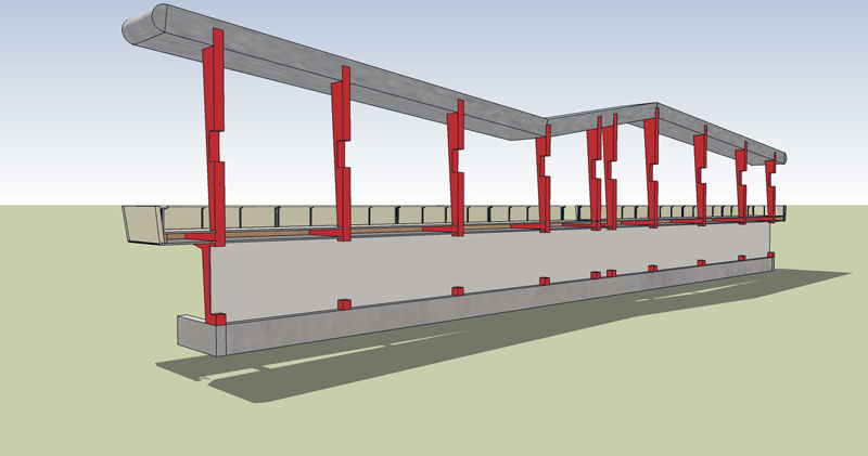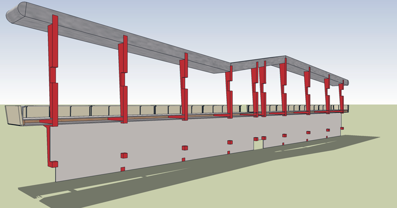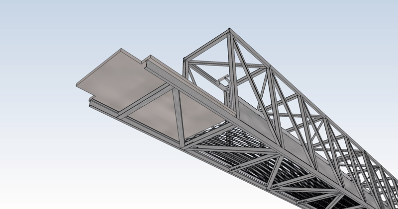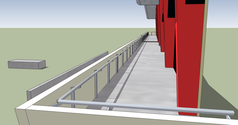 Les parties supérieures de la passerelle intégreront les garde-corps, les mains courantes et tout le système d'éclairage du bâtiment principal.