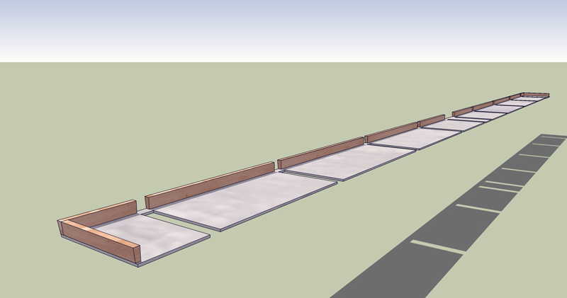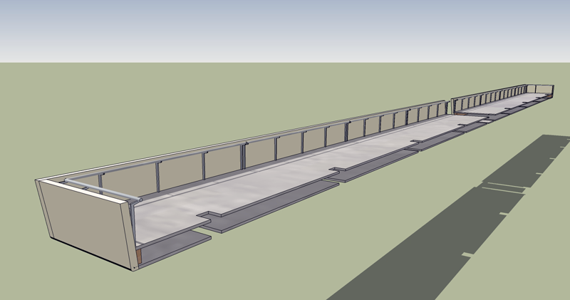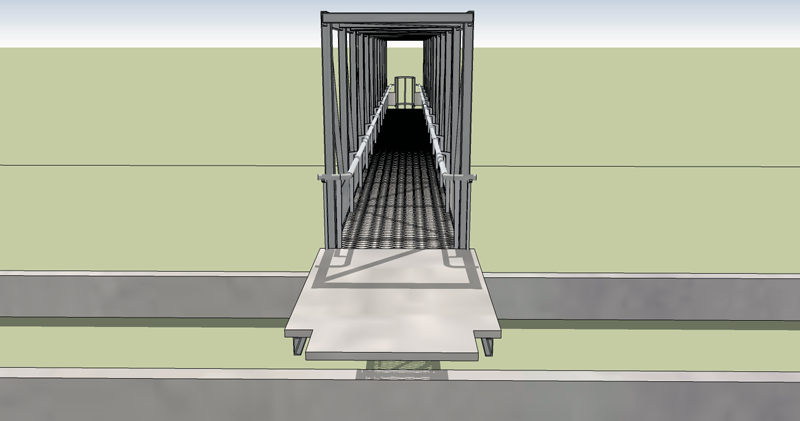 Pour faciliter le démontage de la passerelle, les points d'ancrage seront juste posés sur les piliers centraux. Sur ces points d'ancrage reposera une dalle imitation béton comme celui du sol de la passerelle au-dessus des garages.