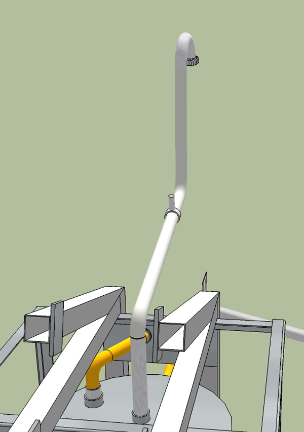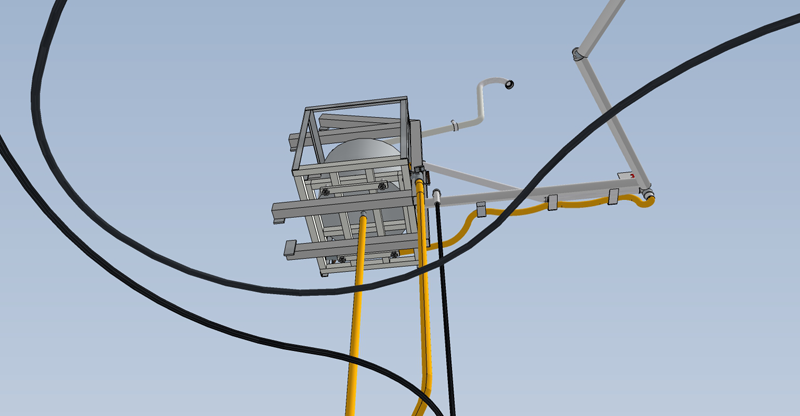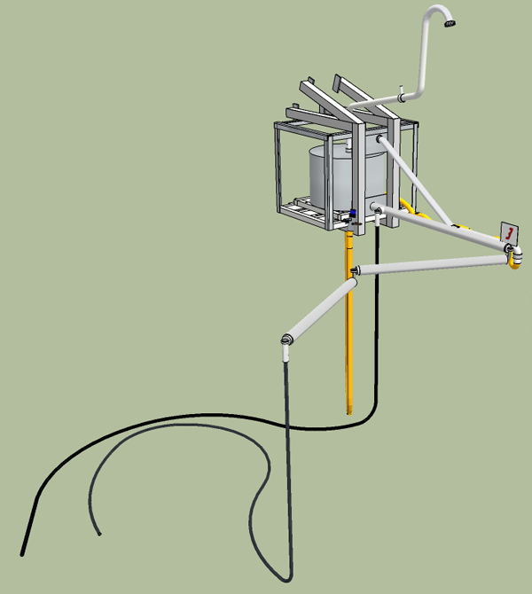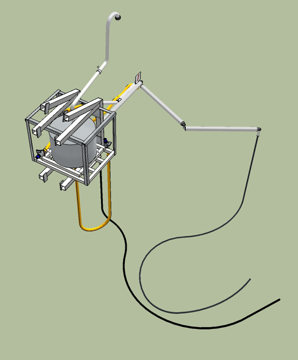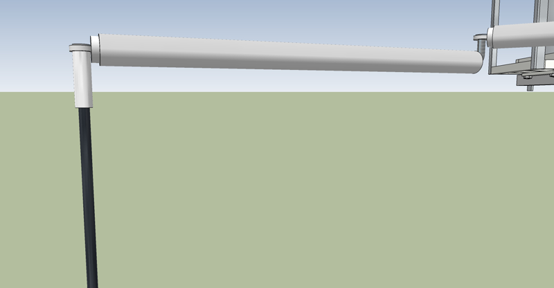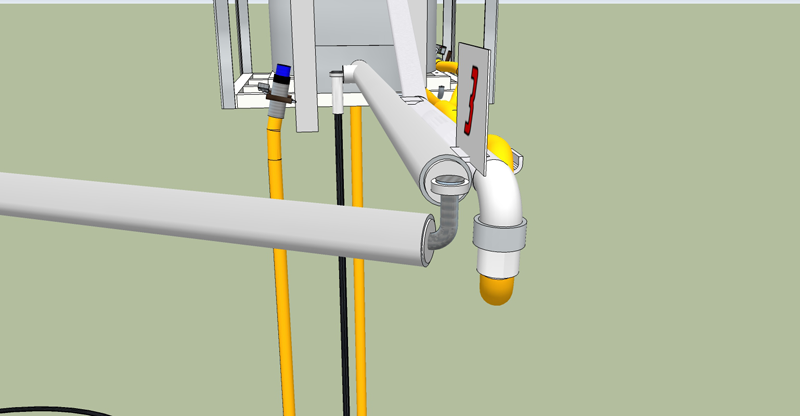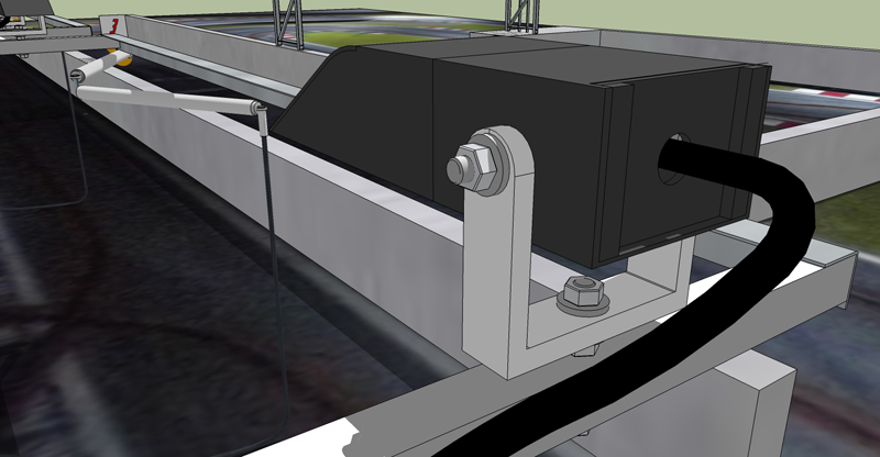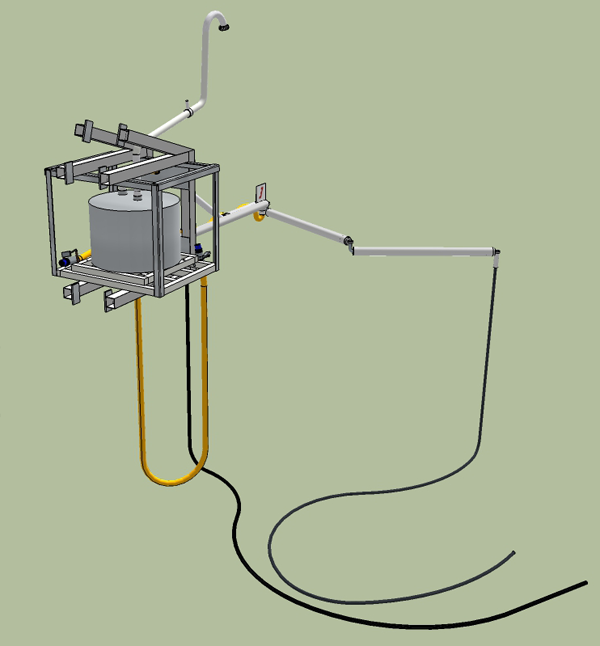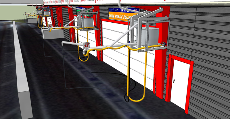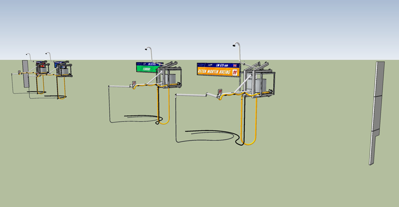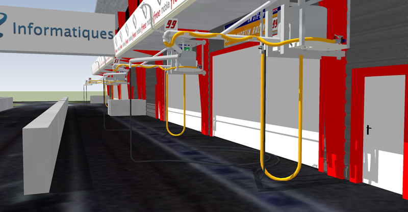 La perche de la pompe chevauche la moitie de la voie d'accès aux stands et la conception du bras télescopique articulé pour les tuyaux d'air comprimé des pistolets (qui seront mobiles) s'adapteront bien. La hauteur sous la perche la plus basse fait 7,5 cm. Les véhicules passeront largement en dessous