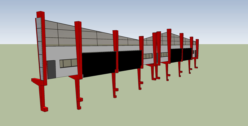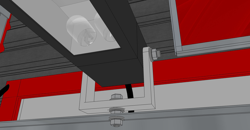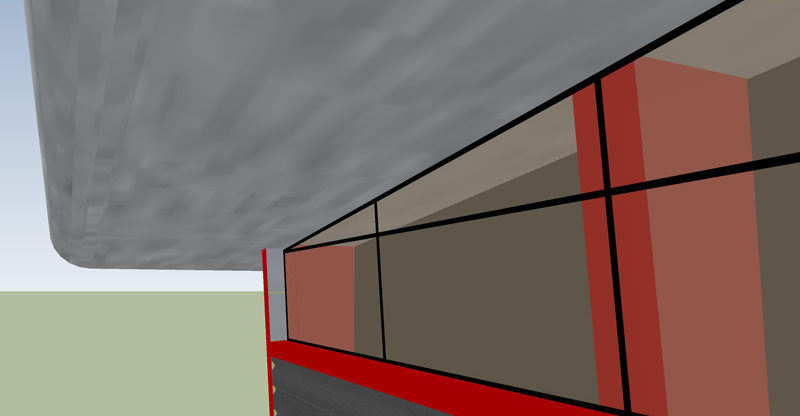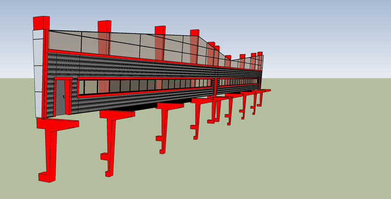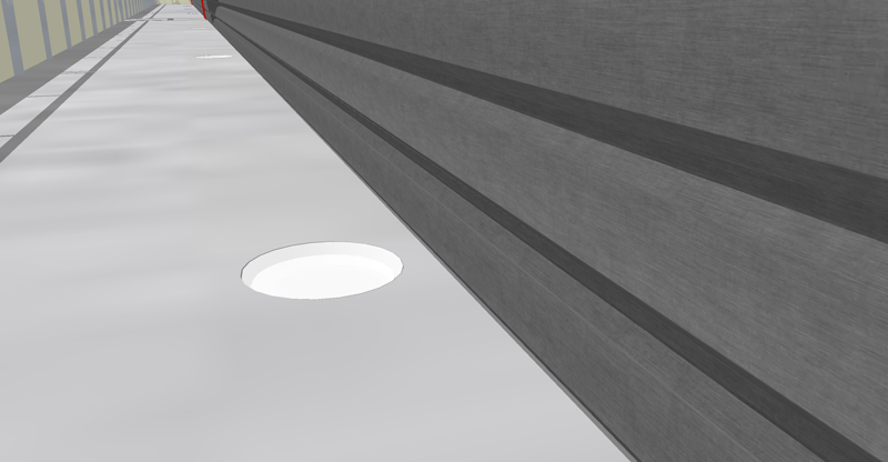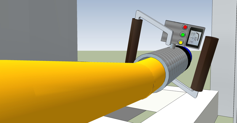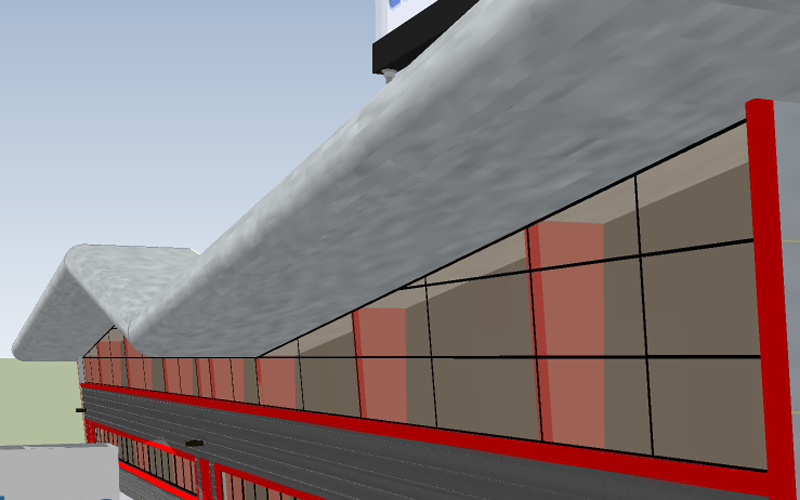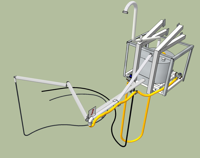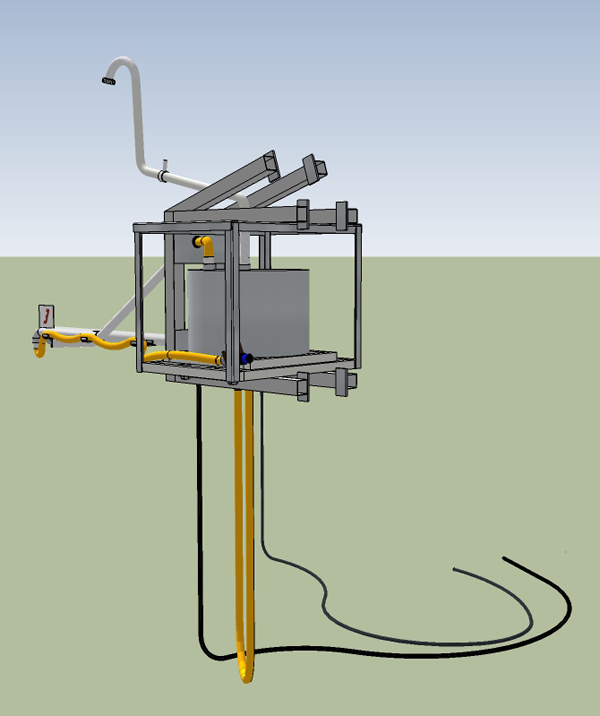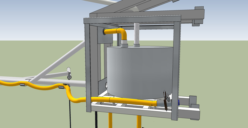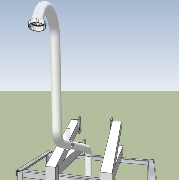 La perche de la pompe chevauche la moitie de la voie d'accès aux stands et la conception du bras télescopique articulé pour les tuyaux d'air comprimé des pistolets (qui seront mobiles) s'adapteront bien. La hauteur sous la perche la plus basse fait 7,5 cm. Les véhicules passeront largement en dessous