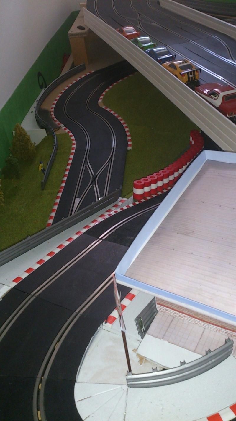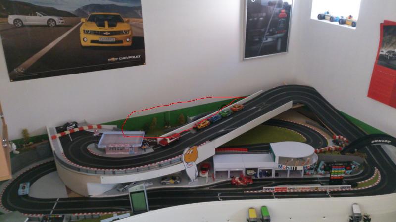 ma 1ère idée serait de déplacer la goutte d'huile ailleurs, et prolonger les stands jusque sous le pont (sois en fabrication maison, sois avec des stands carrera réadaptée en coupant le fond).