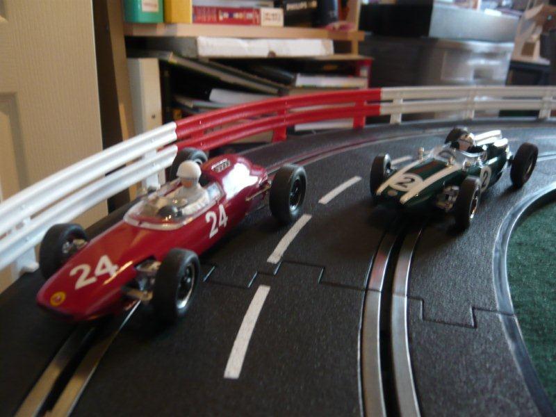 Je serais tenté de revenir à ma première idée de la photo de la N°6 de Taylor au GP d'Allemagne. Un grillage de chaque côté, 2 échappements allongés et hop...