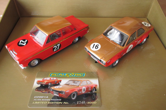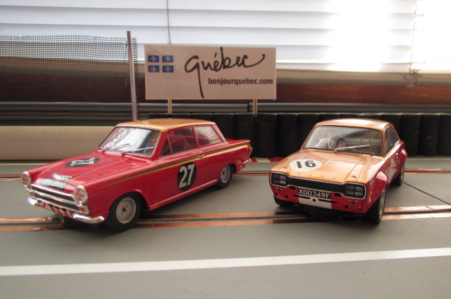 Ça roule très bien en 9 ou 10 volts sur ma piste bois, pneus d'origine et sans lest. Train arrière légèrement survireur, très réaliste. La Cortina est un peu moins stable que l'Escort, à cause de ses pneus plus étroits et de ses porte-à-faux plus importants. Le petit moteur "FF" suffit amplement à la tâche, car les voitures ne pèsent que 70 grammes.
