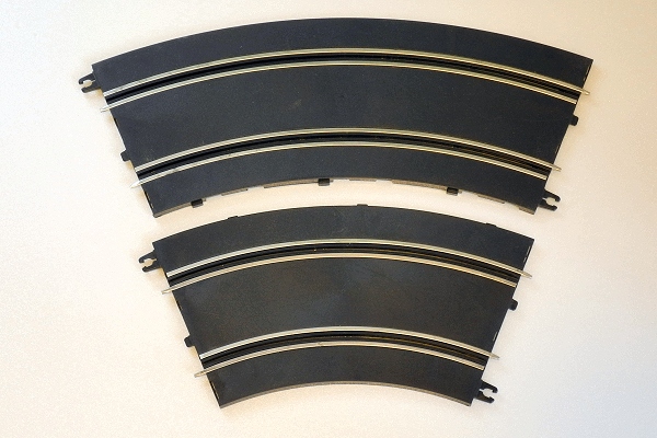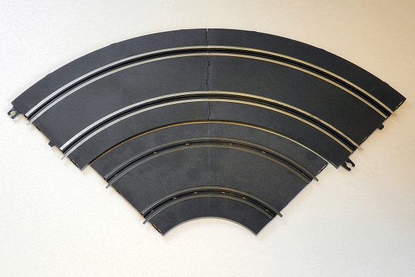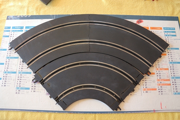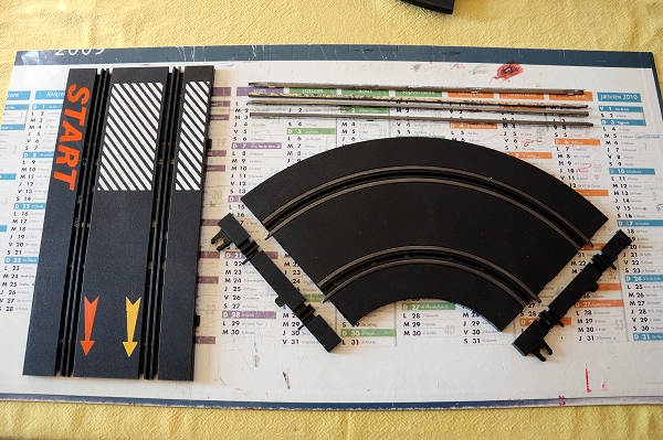 Pour la piste 1/43, j'avais certains critères en tête; des rails assez larges, modernes, et avec 3 rayons de courbes. J'ai retenu le Jouef de dernière génération, le "large". C'est assez facile à trouver (hormis les R3, et il m'en manque encore quelques uns pour bien faire...) et à petits prix en prime ! Il y a quelques contraintes mais des avantages intéressants notamment l'écartement des voies à 68mm contre par exemple 57mm pour le Carrera Go. J'ai donc maintenant un petit stock suffisant pour faire un tracé simple en attendant mieux pour plus tard.
