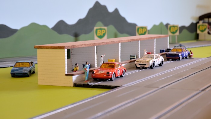 Tout comme pour le 3 pistes, les rainures découpées des pistes 1 et 4 permettent d'insérer les barrières. J'en ai récupéré de 3 sortes; des Scalex modernes, des murets que j'ai faits en carton fort, et d'autres barrières qu'il me restait de coffrets Scx Compact