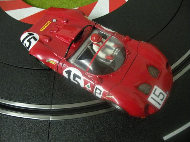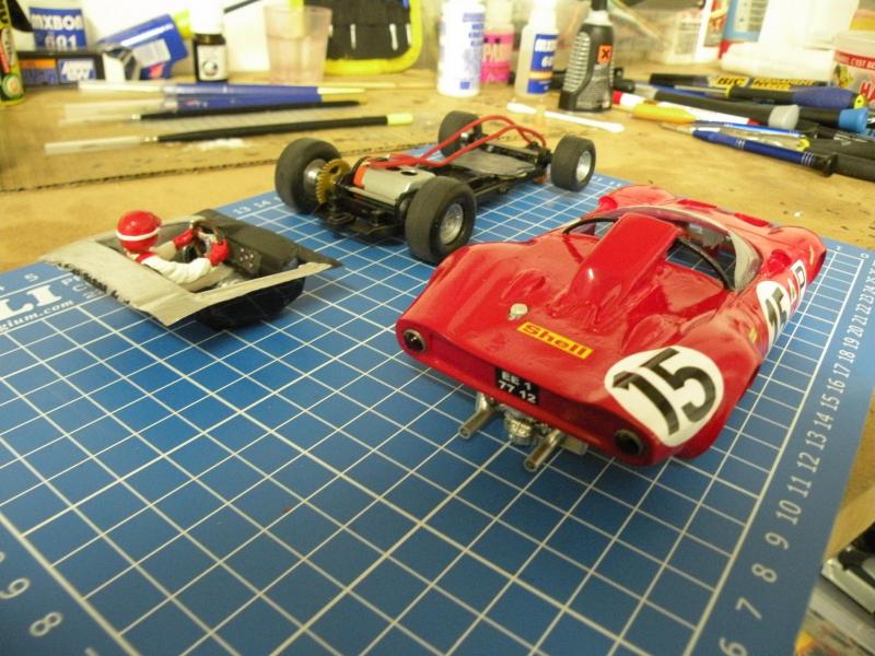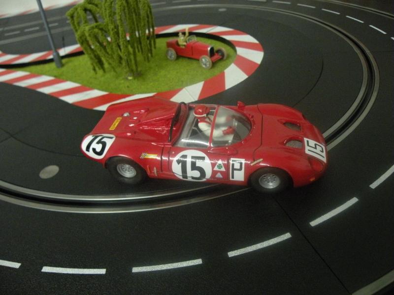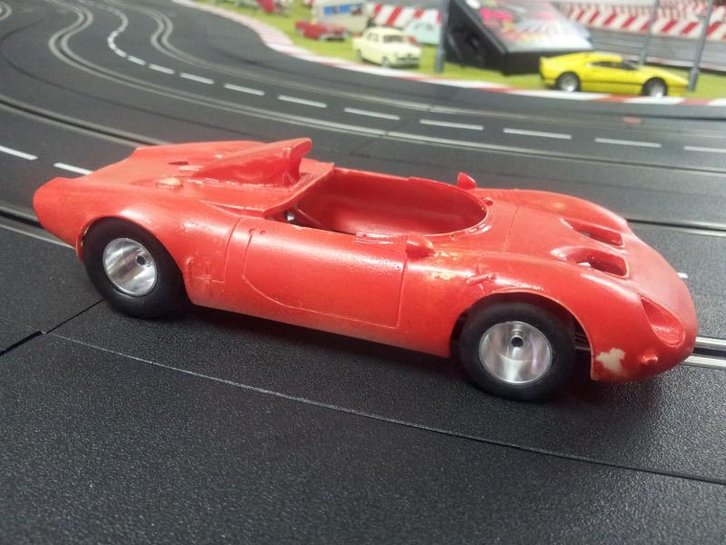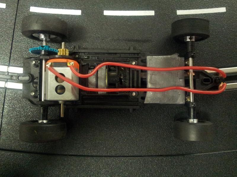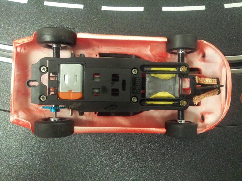 J'ai réussi à adapter un chassis HRS2 en allongeant de quelques mn à la dremel le rail qui fait coullisser le train avant. Maintenant elle a au moins une mécanique qui fonctionne très bien avec des pneus NSR ultragrip collés à la piste.
