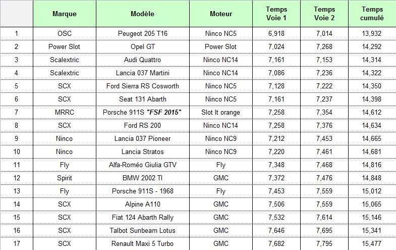 la seule "prépa" que l'on fait se résume à roder (moteur et pneus), huiler la transmission, changer les tresses par des MB slot (meilleure prise de puissance et moins d'effet "ressort" que des grosses tresses d'origine), un bout de plomb le plus près possible de l'axe avant et hop terminé!! et chez nous la sunbeam et l'escort ne sont pas vraiment moins rapides que les autres... il n'y a vraiment que la R8 qui soit décalée en performances... du coup on fait des courses spéciales R8....