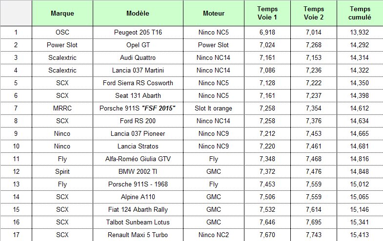 tout pareil que pour viraufrinun grand merci à toi pour les infos... le RX91 doit effectivement être beaucoup plus véloce que les autres car on a fait quelques courses chez imagilles en 12,5V avec une MG metro MSC en NC2, une 635 Spirit en NC2 et une opel gt powerslot en moteur d'origine et une delta S4 SCX et franchement même sur son circuit très rapide, les 4 autos étaient très proches et même dans sa grande ligne droite... bref que du bonheur cette soirée...