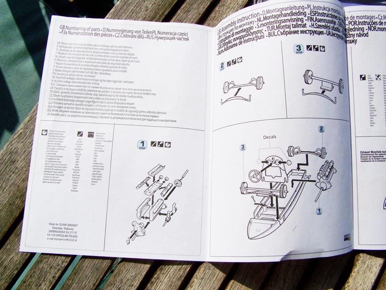 La notice de montage, ne ferait pas peur à un enfant de dix ans. Elle est d'ailleurs presque superflue, bien que sur la boite ne niveau de difficulté est noté "3" !?! Sans doute le froid en Pologne oblige les maquettistes à pratiquer avec des mouffles.