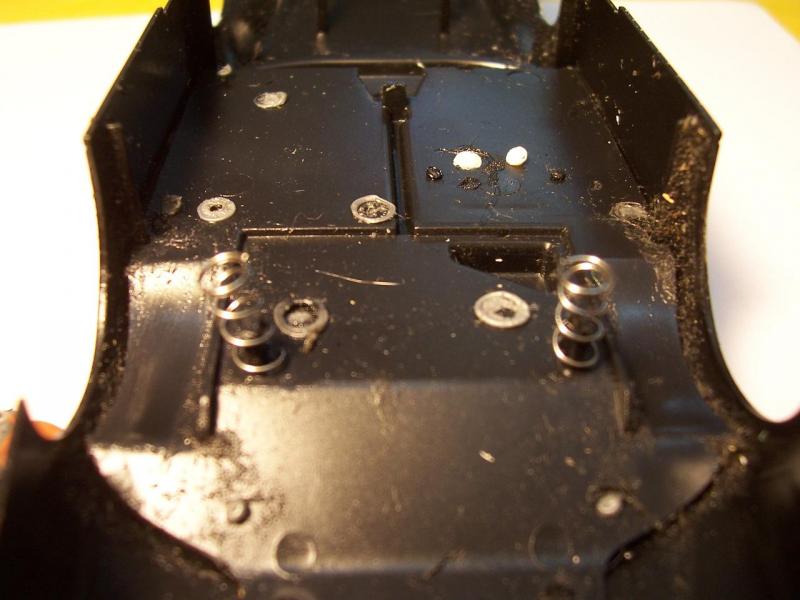 De part sa conseption , le berceau moteur se prette facilement au montage de cette suspension.Il suffit de supprimer le petit téton du berceau qui s'enclicte dans le chassis. Ensuite il faut raccourcir de 2 mm les pattes de la carosserie qui viennent appuyer sur les palier, et diminuer la largeur de ces pattes pour enfiler dessus environ 1 cm de ressort de stylo, remonter la carosserie, la modification prend 1/4 d'heure, on peut faire des essais de dureté avec différents ressorts