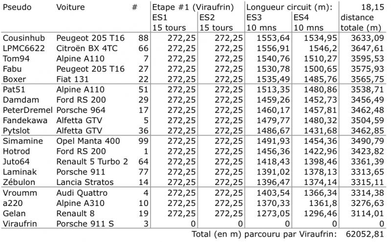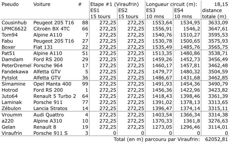 Voici un tableau donnant les distances parcourues par chacune de nos titines lors de l'étape #1 chez Viraufrin: