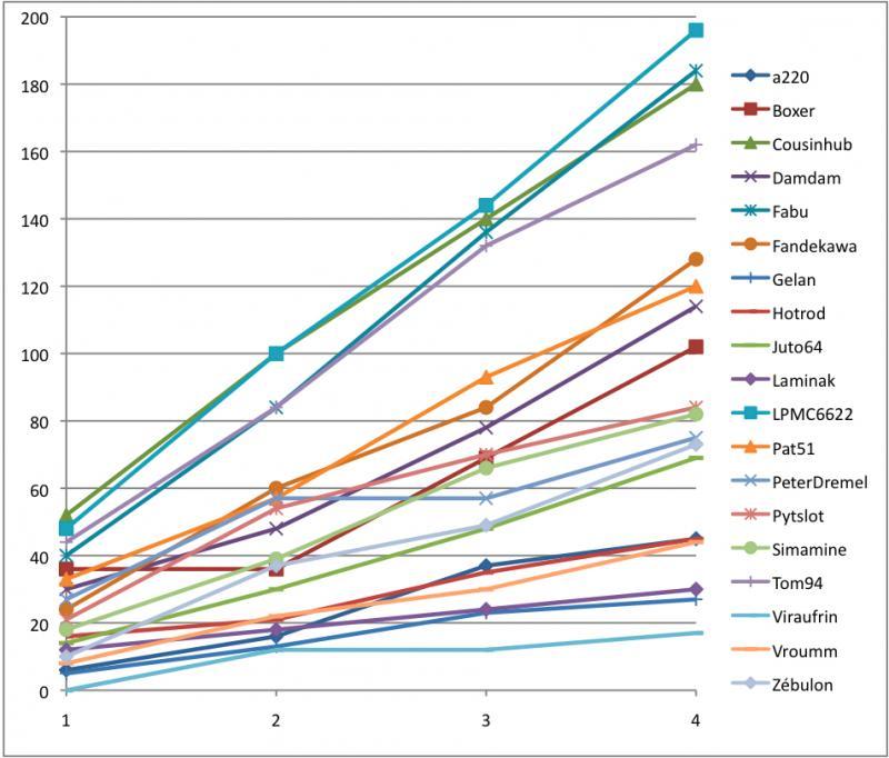 En attendant le calcul des distances, voici le graphique montrant l'évolution des positions à l'issue de la 4ème étape (résultats bruts, sans décompte du plus mauvais résultat):