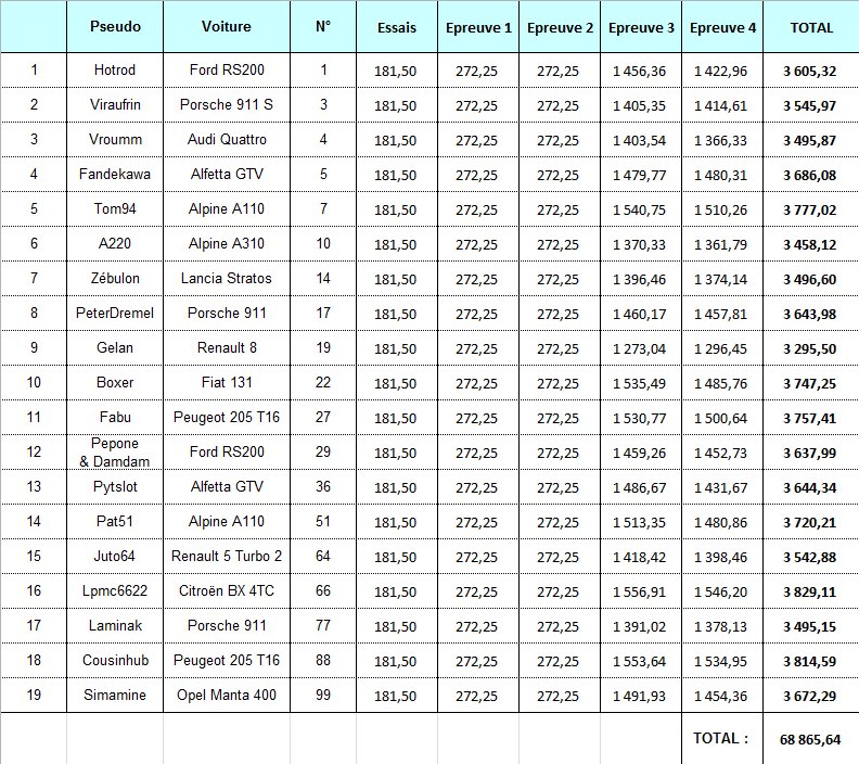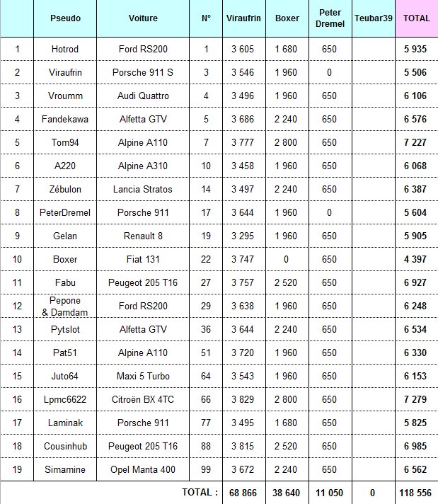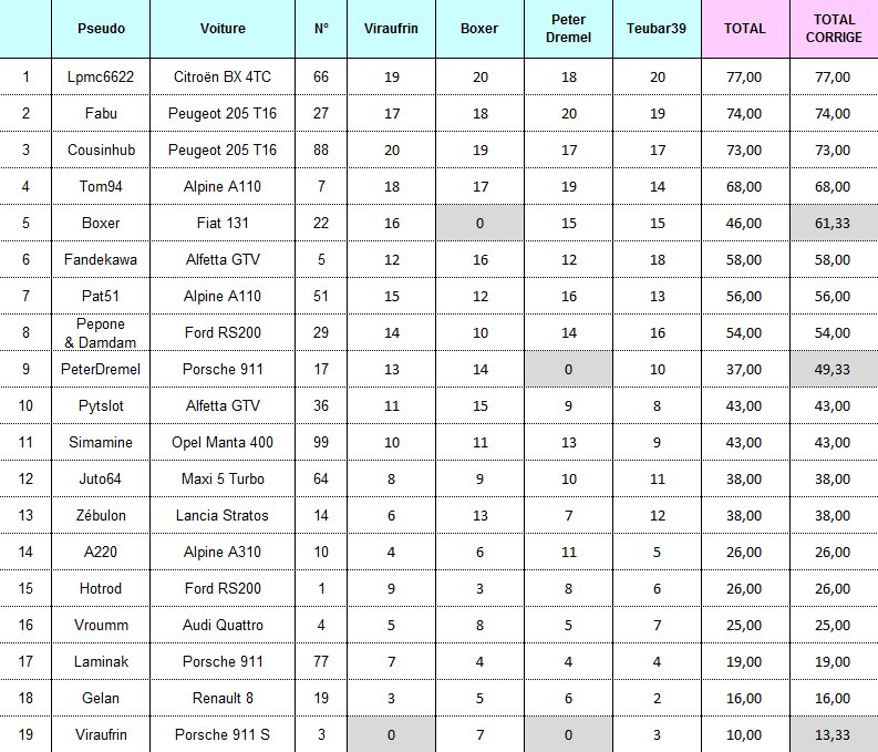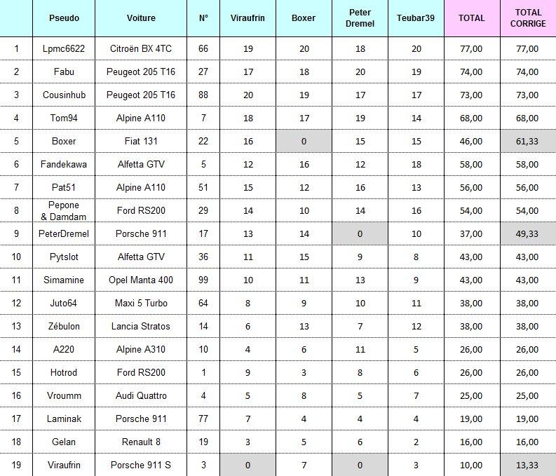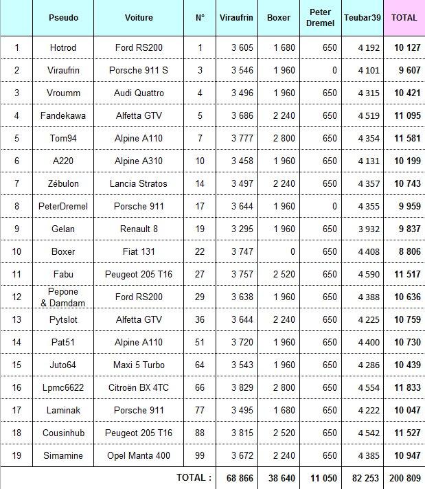 Bien, et pour reprendre un tableau dressé après chaque rallye par mon hebdomadaire préféré, voici le tableau des meilleurs "performers" de la proxi à l'issue de l'étape #4 de Teubar: