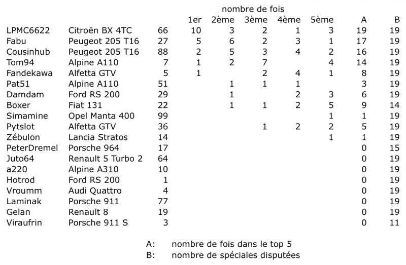 Ce tableau rassemble le nombre de fois où chacun des participants a fini 1er, 2ème, 3ème, 4ème et 5ème d'une ES (Epreuve Spéciale), ainsi que le nombre total de fois où il a fini entre la 1ère et la 5ème place (colonne A) et le nombre de spéciales disputées (colonne B).