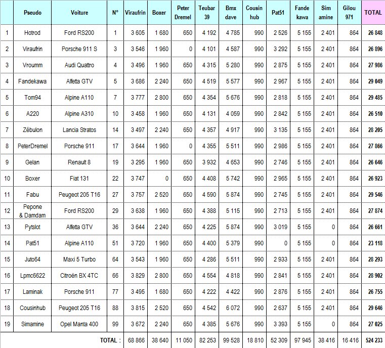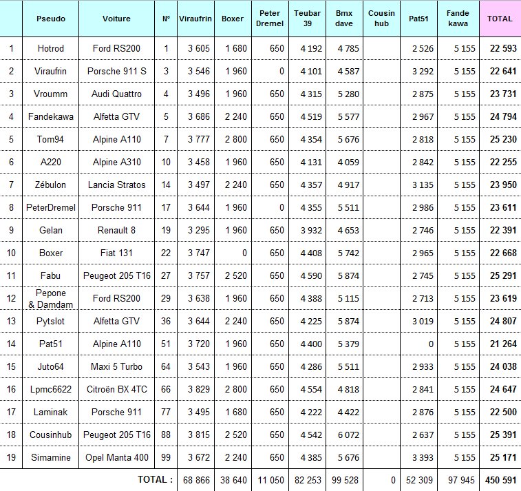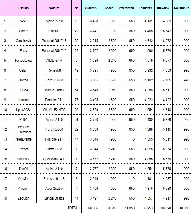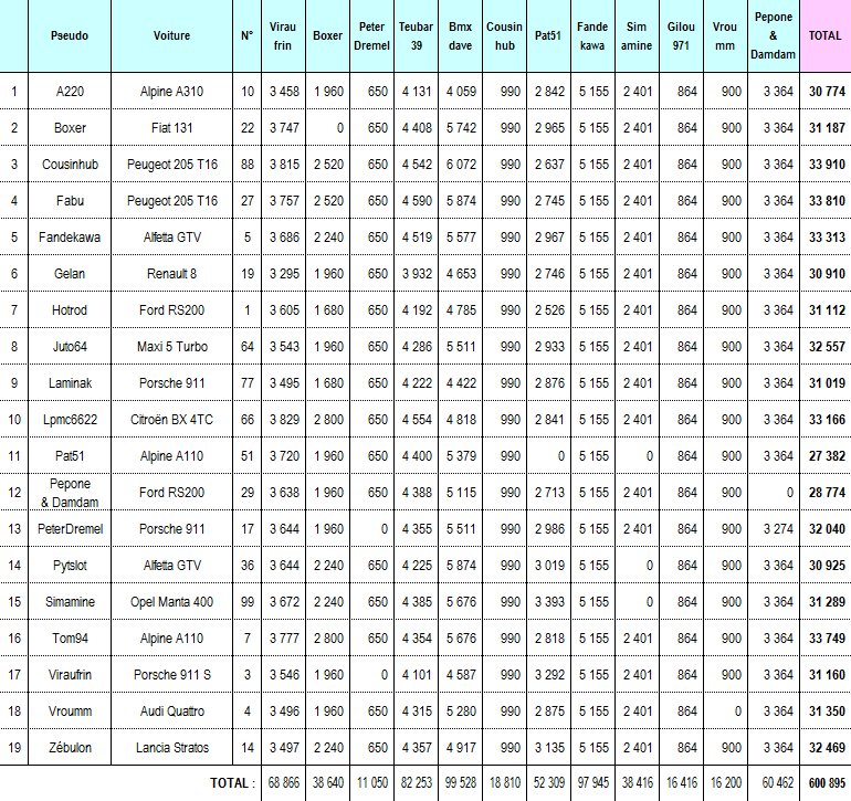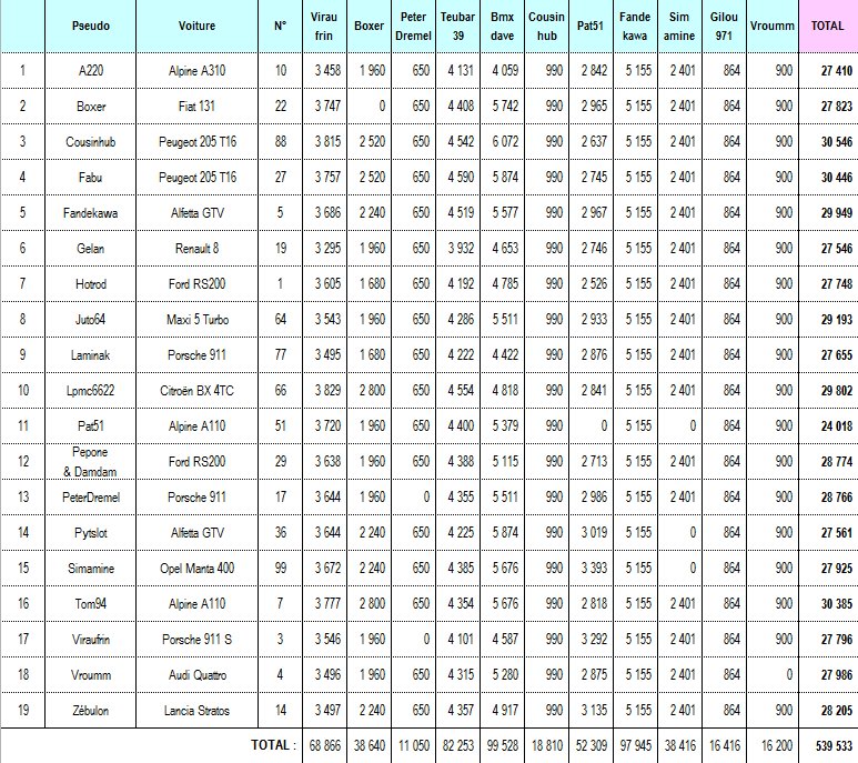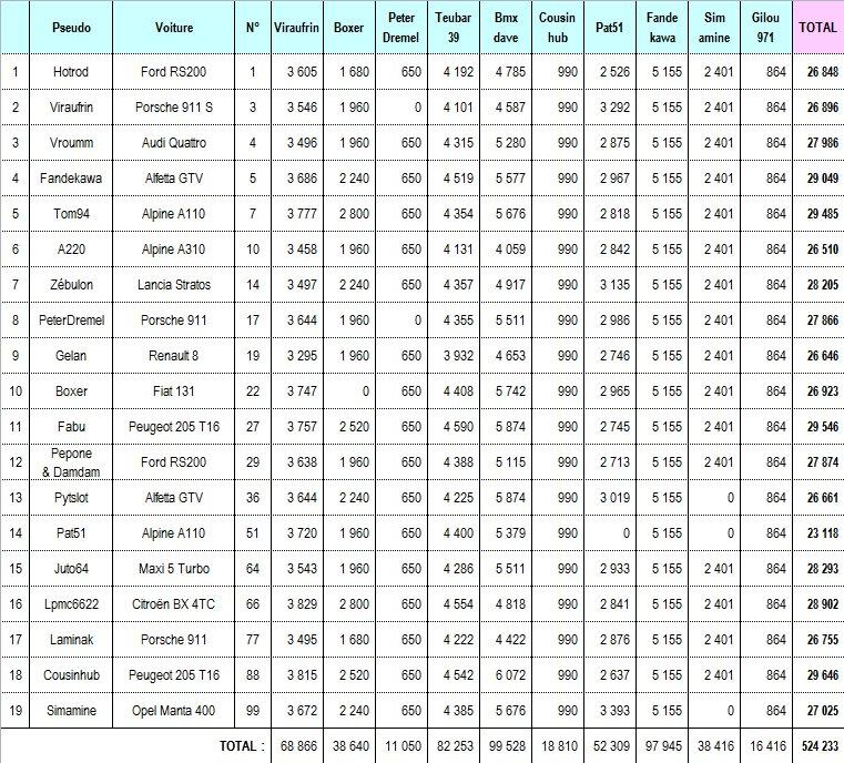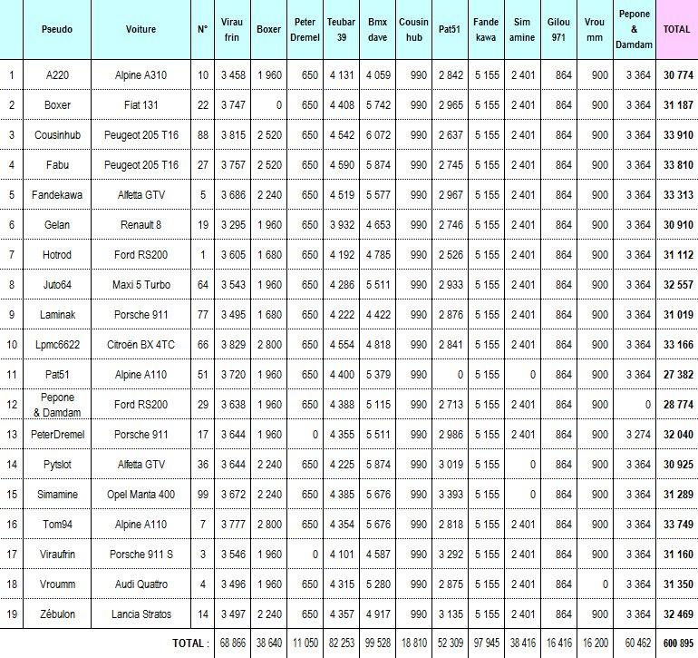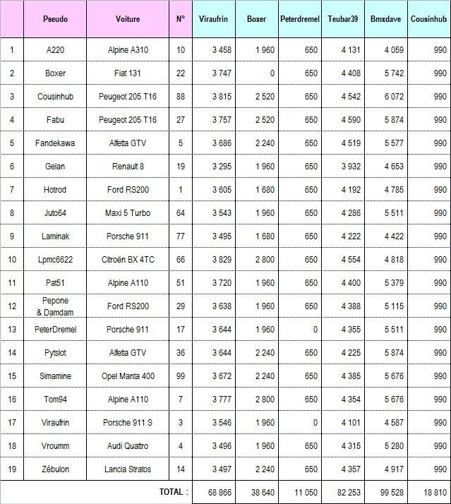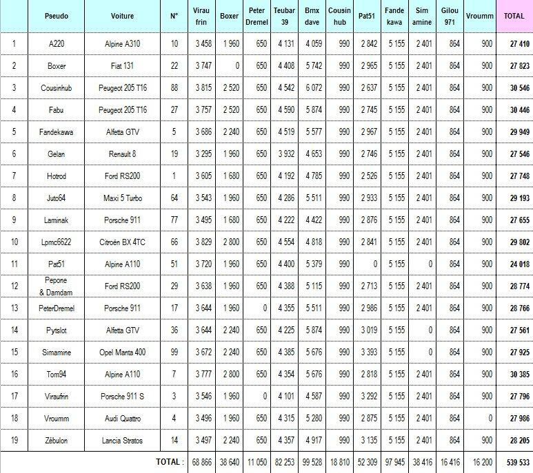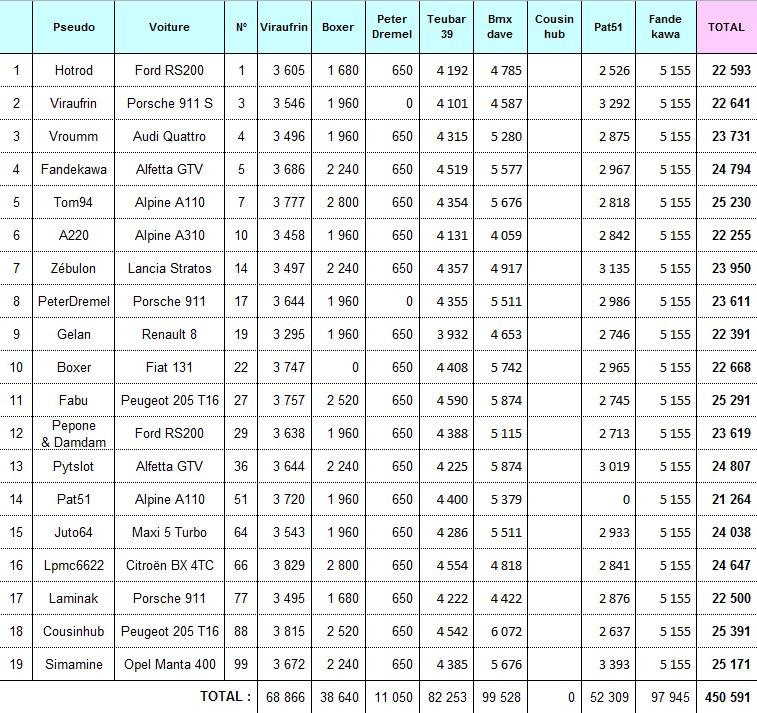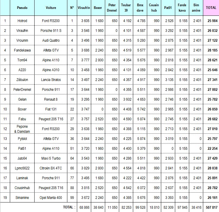 viraufrin, durant mon étape, mon alfa gtv a fait l'ensemble des spéciales comme les autres voitures... elle est classée dans chaque tableau