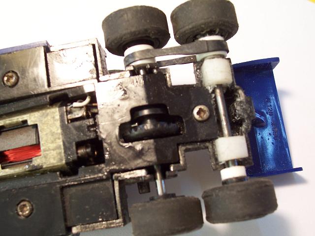 Marheureusement Scalextric n'avait motorisé qu'un seul train , j'ai donc effectué une modif pour avoir les quatres roues motrices, 2 paliers pour bien guider l'axe , 2 poulies provenant d'un magnétoscope, et une courroie coupée dans une chambre à air de vélo, 4 pneus silicone, et nous avons là une voiture très performante dans les passages en courbe