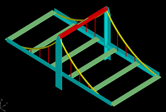 3) concevoir un véritable pont suspendu miniature, avec de vrais câbles d'acier supportant le poids des rails et d'un éventuel tablier décoratif (léger) ; cela implique de construire des piles de pont solides, et de disposer de points d'ancrage des câbles à chaque extrémité du pont pouvant résister à des efforts de plusieurs dizaines de kilos.