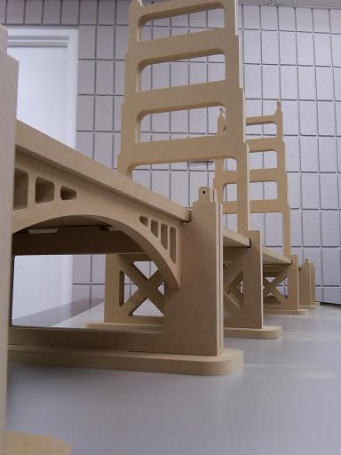 Cette maquette est laide d'une part en raison des matériaux utilisés, d'autre part par ses proportions ridicules avec des piles principales plus hautes que la longueur de la travée.