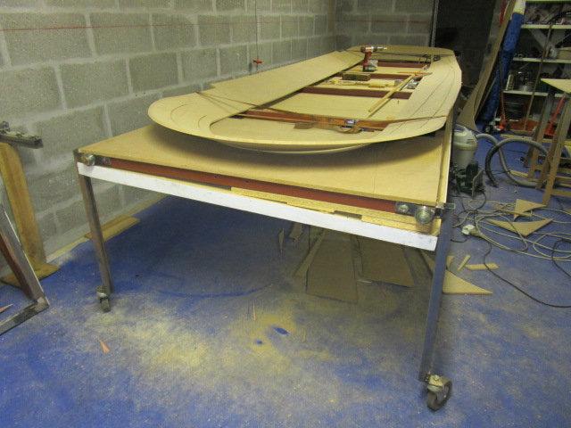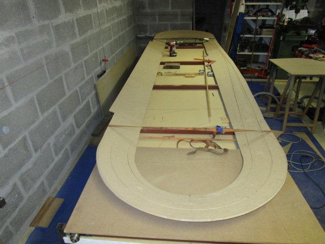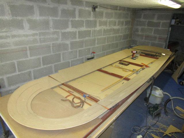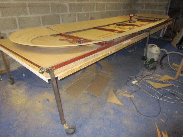 le ptit boulot d aujourd hui....j ai fermé l anneau et defoncé les 3/4 de la piste , le croisement sera chaud , j ai regardé ça passe....c était pas evident.... maintenant la phase de calage / vissage etc va commencer....ah oui j ai sorti le plateau de ses rails et je l ai mis sur ses pieds a roulettes pour pouvoir en faire le tour et aussi pour plus tard pour la maintenance de la piste...
