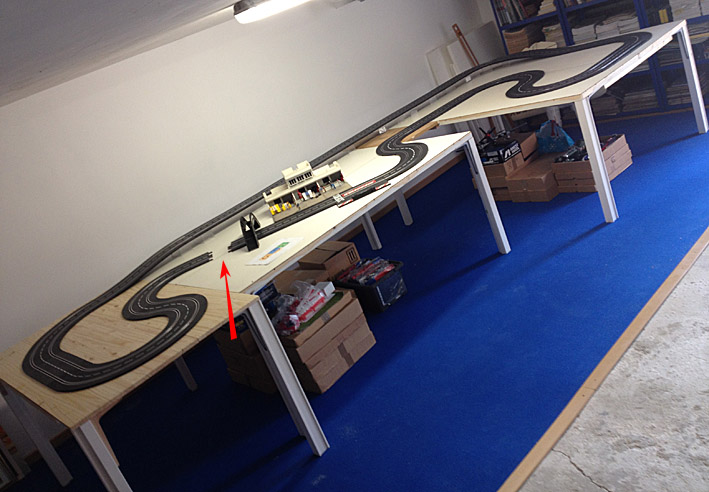 je manque de place, et les rails carrera sont très larges, alors le tracé est tout simple, mais assez fluide et agréable au pilotage. voilà une photo du début des travaux avec le circuit en entier