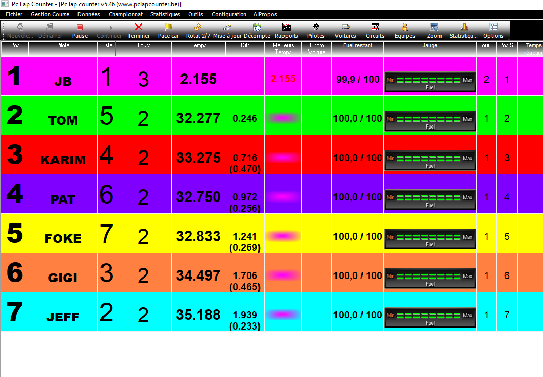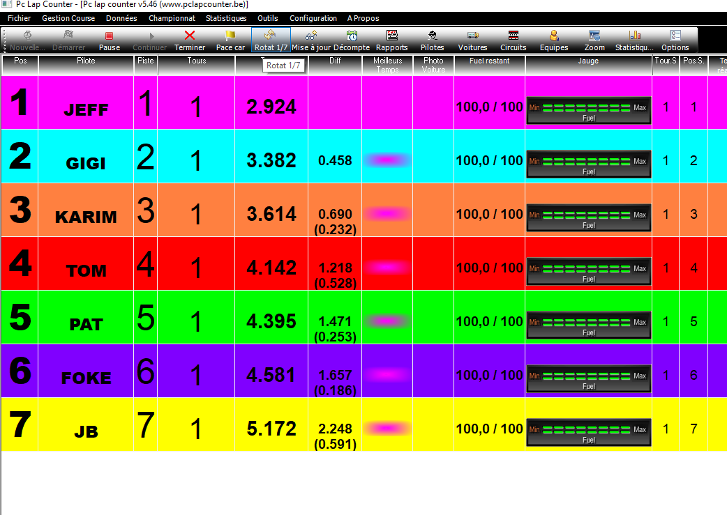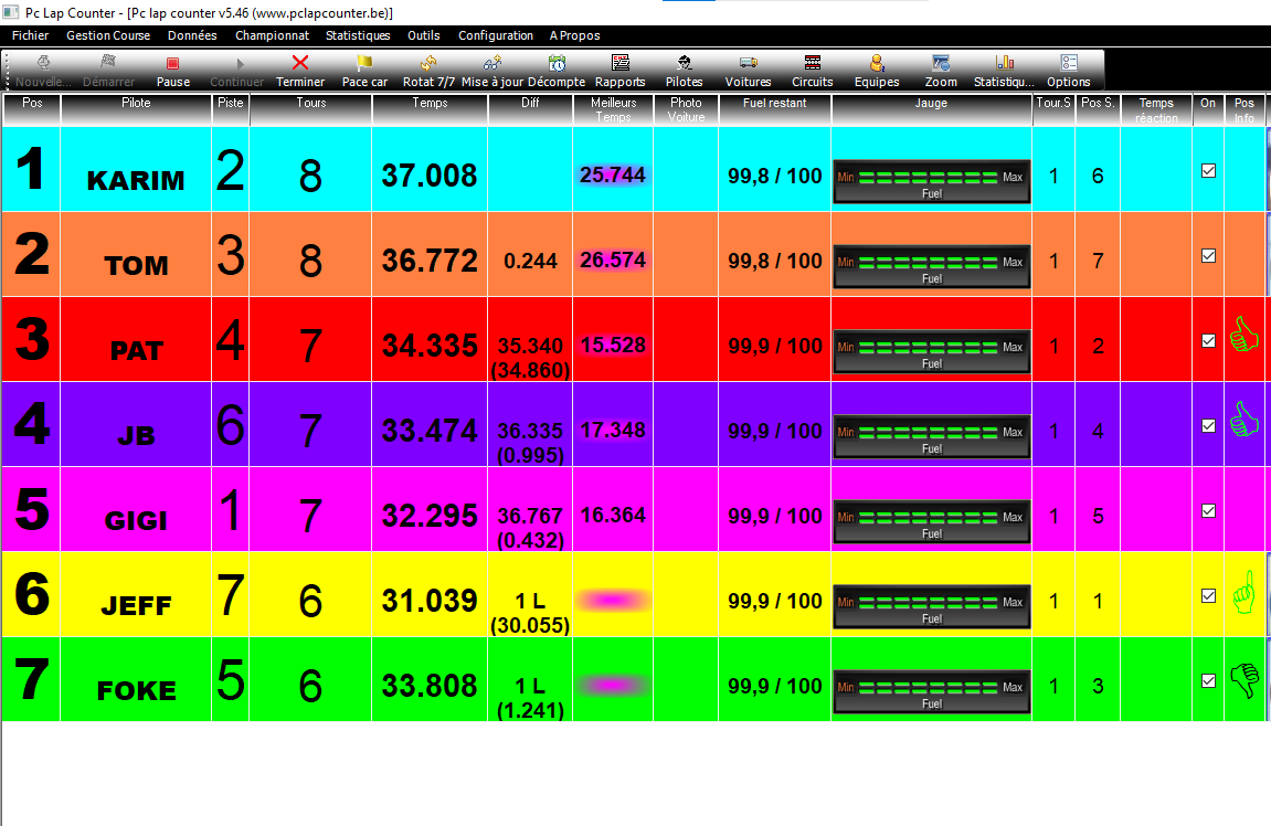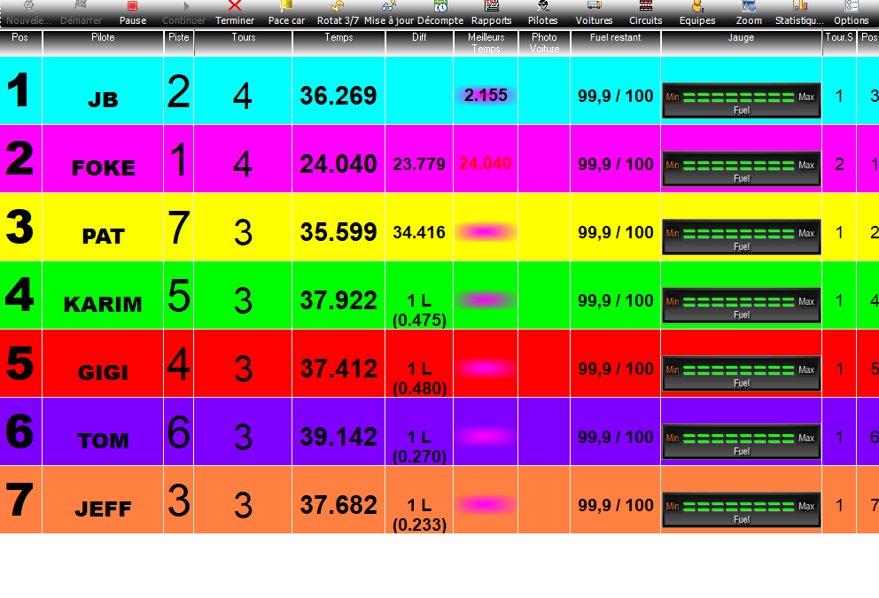 Par défaut, les couleur sont modifiables par colonne dans Pc Lap, c'est à dire que tous les pilotes on la même couleur pour leur patronyme, seuls les fonds sont modifiables, (couleurs attribuées à chaque piste) alors qu'il faudrait être par ligne, afin de ne pas se perdre ( cf: chrono Davic) quand on veut retrouver son classement sur l'écran, et en particulier pour consulter le niveau de la jauge d'essence.