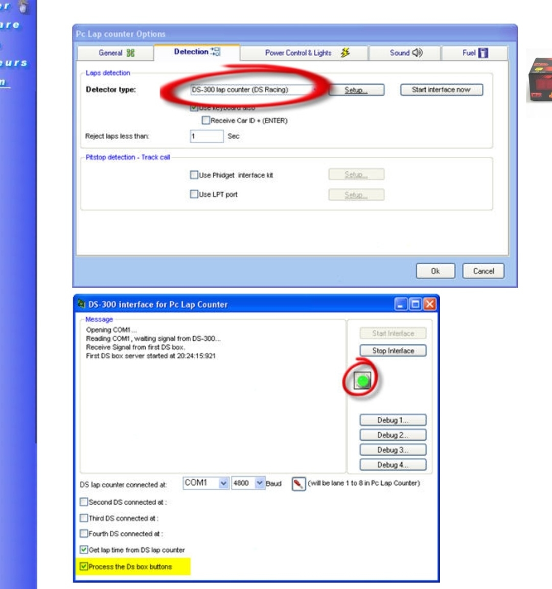 J'ai télécharger PCLAPCOUNTER (mis DS200 en mode tours 9999 et même 10 puisque c'est la version démo) puis PCLAP renseigné dans détection DS200 puis appuyé sur config et le petit voyant vert s'est allumé, je démarre la course les cinq feux s'éteignent et la rien pas de jus dans les pistes. c'est pas tip top