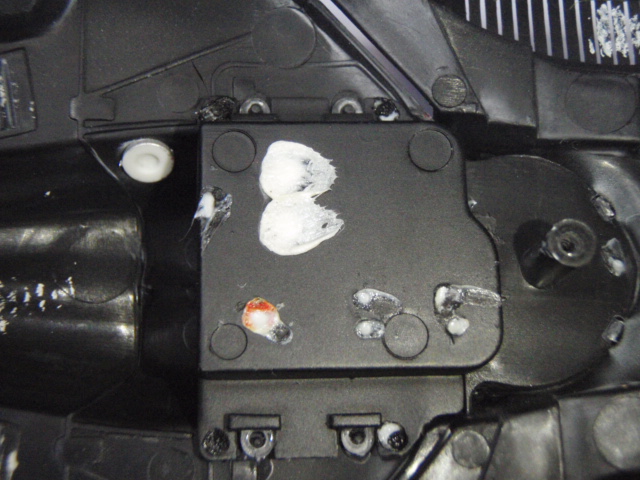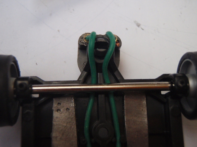 Le chassis, le même pour les 3 voitures. Même moteur, cage orange. Le chassis Audi a une couronne noire et des fils noirs. Les 2 Peugeot des fils verts et une couronne verte.