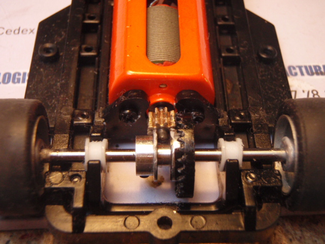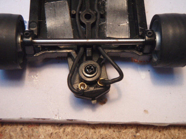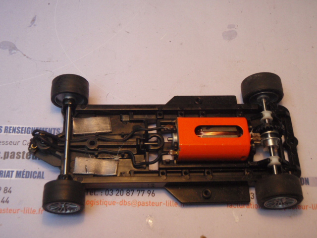 Avant de poursuivre rodage à 5 volts pendant 10 heures. Graissage et lubrification de tous les éléments. Changement des pneus par des P6 19*10 à l'arrière et des 17*10 zéro grip à l'avant de chez slot-it.