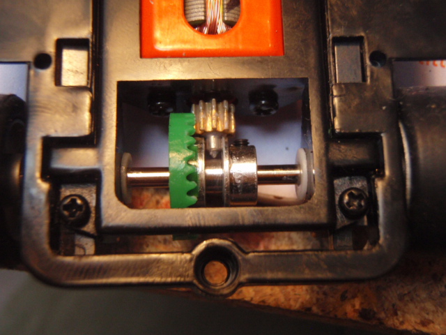Le guide a vis, on en reparlera tout à l'heure. Le moteur tenu par des vis sur le chassis. Une bonne chose cela évite de devoir le coller avec du scotch à fibre. Des vis sont également accdessible par le dessous pour régler la hauteur du chassis.