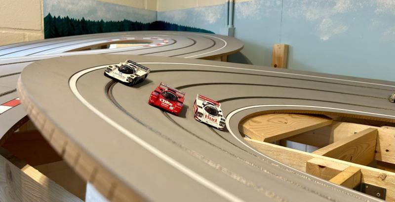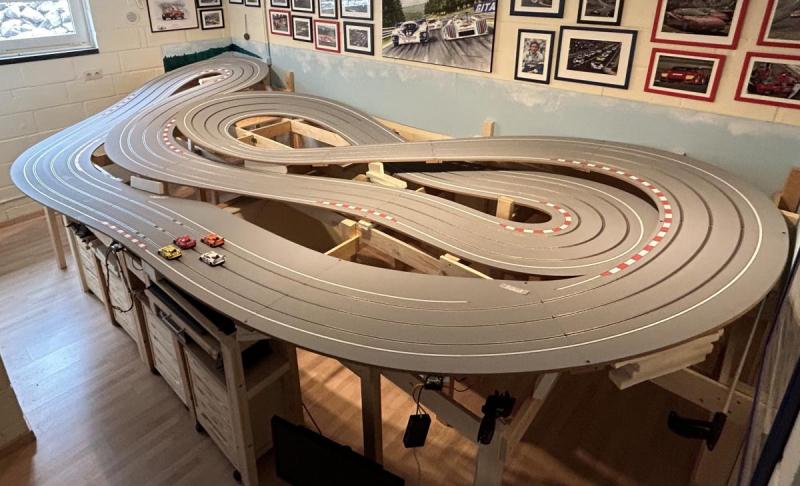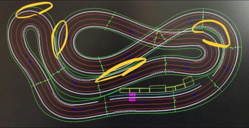 En effet, comme la piste remplit bien l'espace, les morceaux de piste sont proches les uns des autres et les dérives des voitures dans les virages extérieurs ont donné lieu à des contacts avec un autre morceau de piste ou bien avec un élément placé au mur, par exemple. J'en ai annoté quelques-uns sur le dessin ci-dessous: