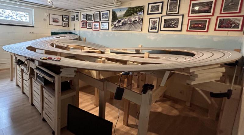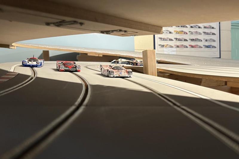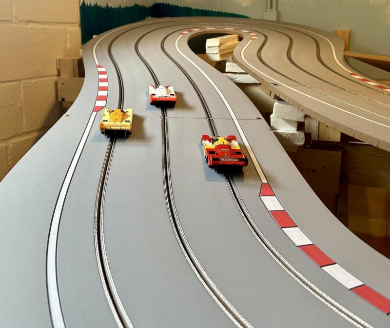 Vous apercevrez au passage que le circuit repose à l'heure actuelle sur le châssis en étant calé exclusivement par des plaques de polystyrène qui se seront révélées bien utiles! Un de mes prochains travaux sera de remplacer ces petites plaques par de petits ajouts « en dur » avec des planchettes en bois etc, L'autre chantier, tout aussi urgent, va être de placer des barrières aux endroits les plus dangereux, ceci afin d'éviter des chutes malencontreuses …