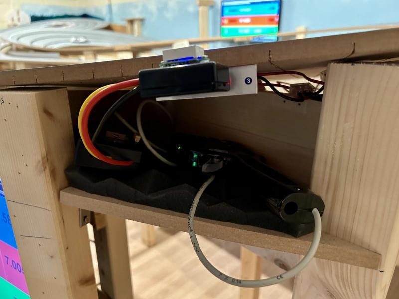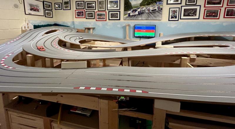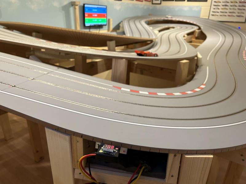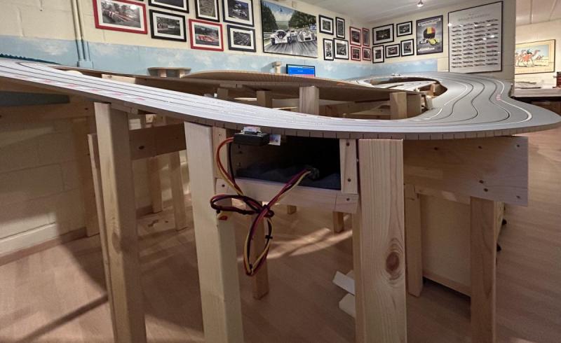 Non seulement rien n'est plat, mais en plus une partie significative de la piste est inclinée! C'est notamment le cas de la ligne de départ, qui pour simplifier le tout se trouve au-dessus des appareillages (alims, clavier, souris, écran etc.). Ça m'a occupé pas mal de temps et voici à quoi ça ressemble vu des coulisses …