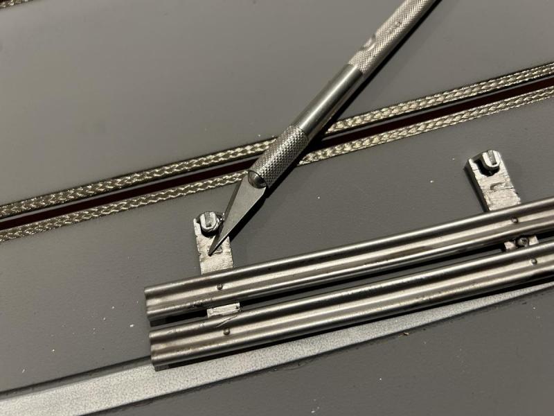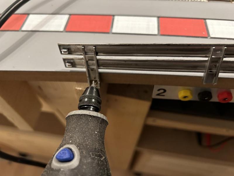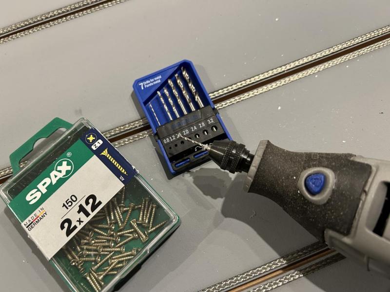 Il me faudra là aussi un peu de patience puisque je vais devoir retirer les ergots à la base de la barrière et forer de petits trous dans la barrière puis sur le côté des sections de la piste pour la fixer correctement.