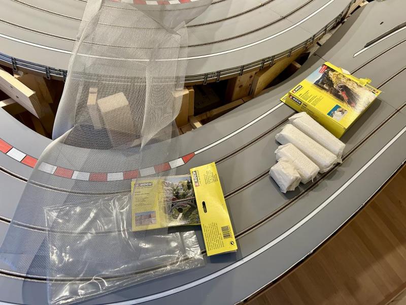 J'ai commencé par protéger le bord de piste, puis j'ai meublé un peu plus la structure, sur laquelle je vais fixer un petit treillis qui supportera des bandes de plâtre: