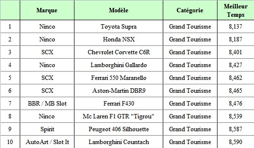 Voici le tableau des 6 voitures les plus rapides, toutes en dessous de 8,5 s au tour.