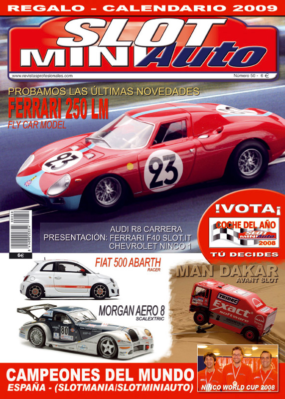 En première page du Slot MiniAuto de Décembre, la nouvelle Ferrari 250 LM de Fly Car Model, la Fiat 500 Abarth de Racer, la nouvelle SCX Morgan Aero 8 et le Camion Man Dakar d’Avant Slot.