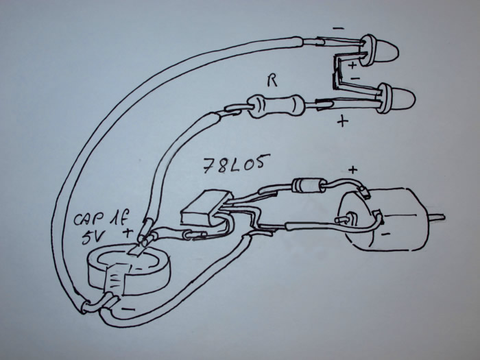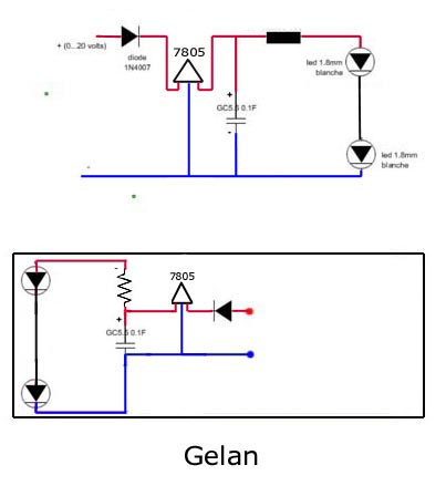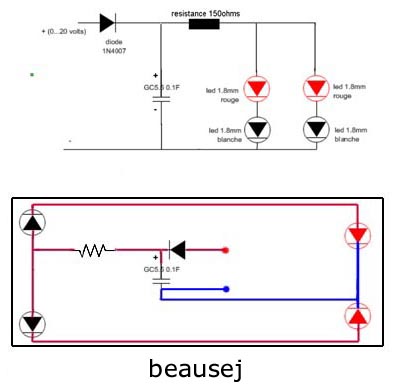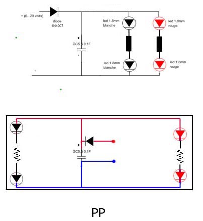 Donc ton schéma est identique au mien (hors régulateur) sauf le positionnement des résistances. Moi j'aime bien entre les leds parce que c'est un truc en moins qui traine au milieu du chassis...
