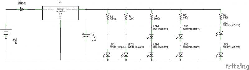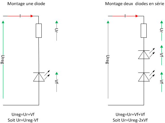 Si on met deux diodes en série, il faut ajouter la tension (Vf) de ces diodes. Du coup, on voit tout de suite que l’on ne pourra pas mettre deux diodes blanche en série en les alimentant en 5V (2*Vf=2*3V=6V>>Ureg=5V).