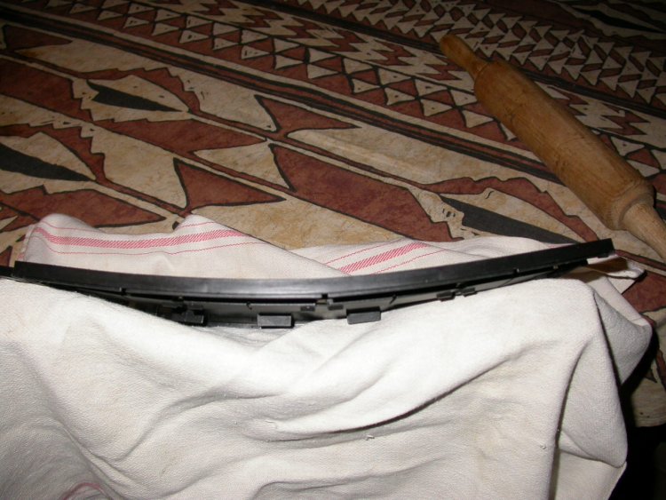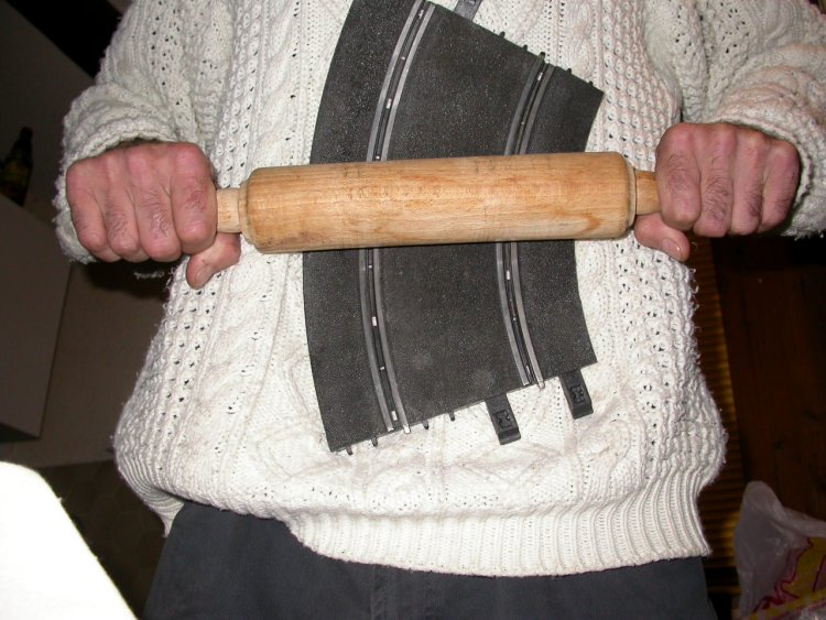 1° placer votre rail sur votre ventre et appuyer en roulant de haut en bas avec le rouleau à patisserie , en dosant la pression vous déformer de façon uniforme le rail: